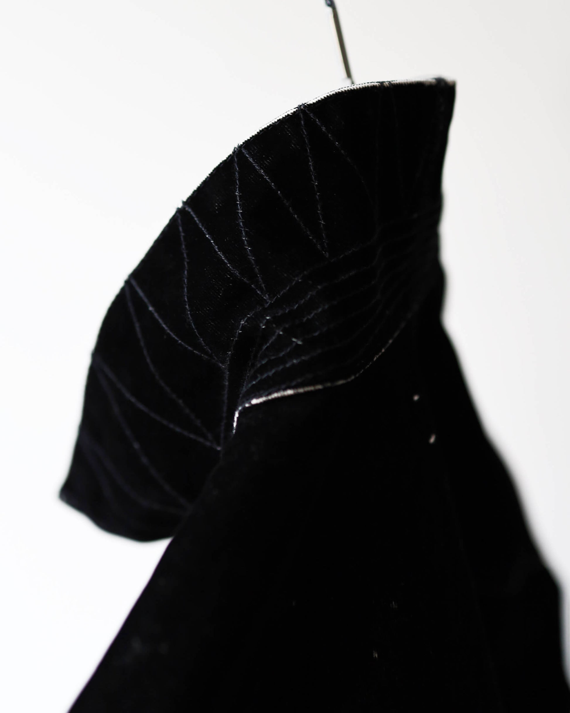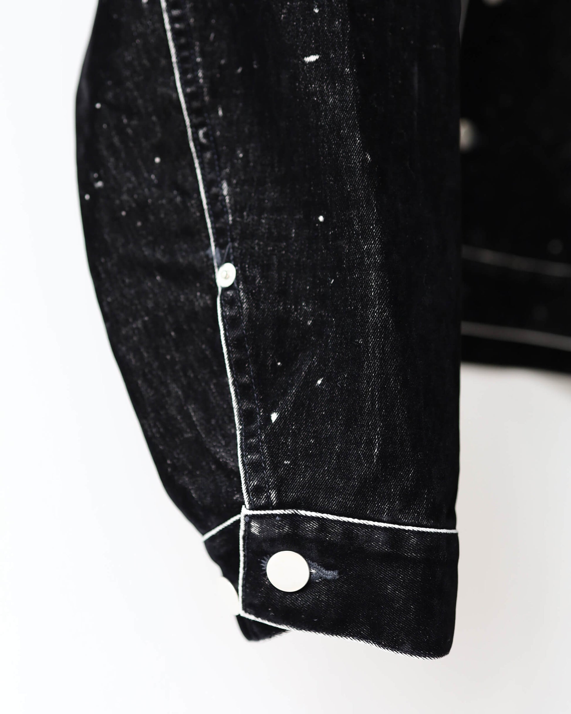 光の反射が少ないマットなブラックとランダムなアタリ。見る者を惹きつける、幻想的なムードを纏った1着。