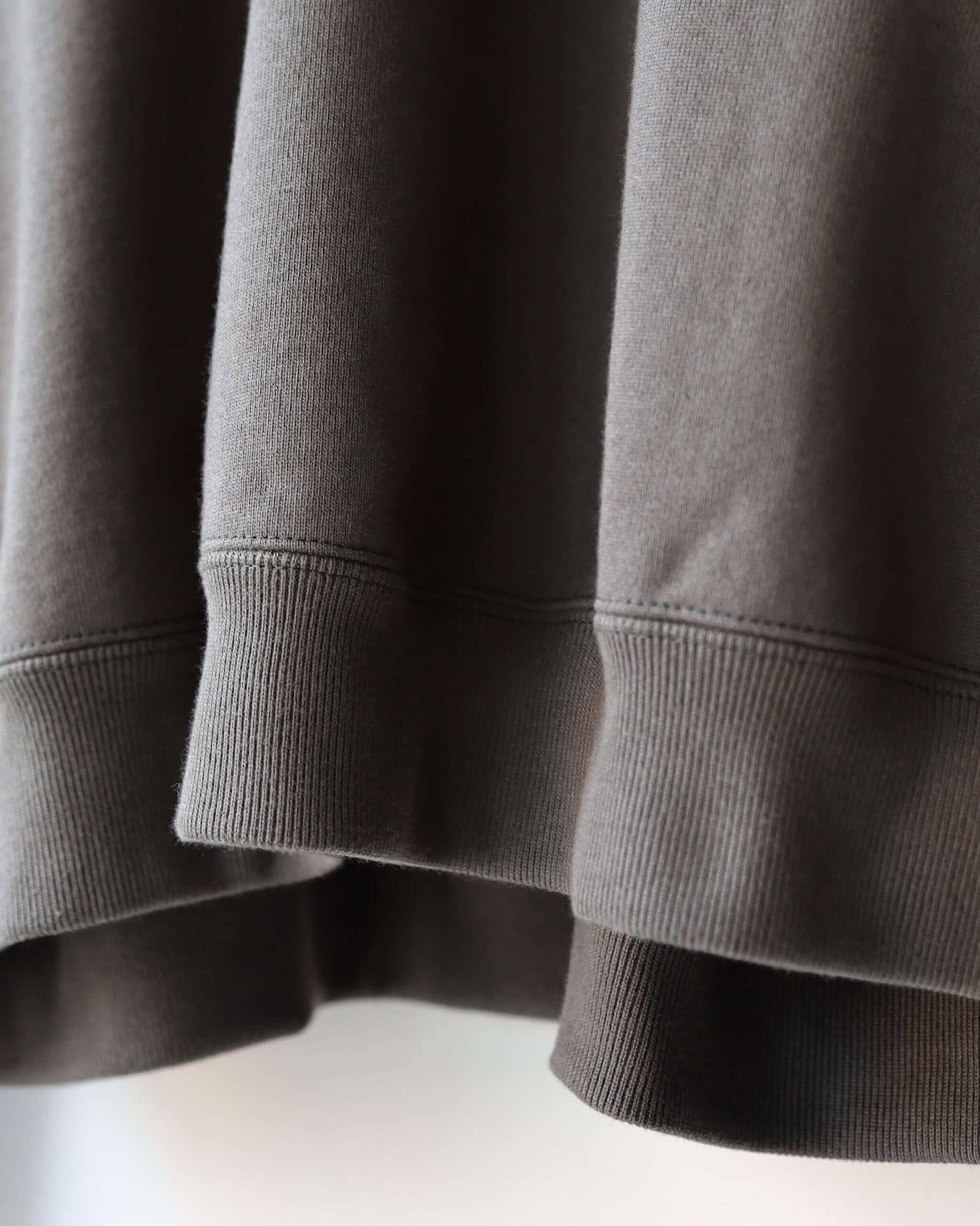 吊り編み機特有のふんわりとした風合いと、緻密に詰められたタフな質感が絶妙に共存。