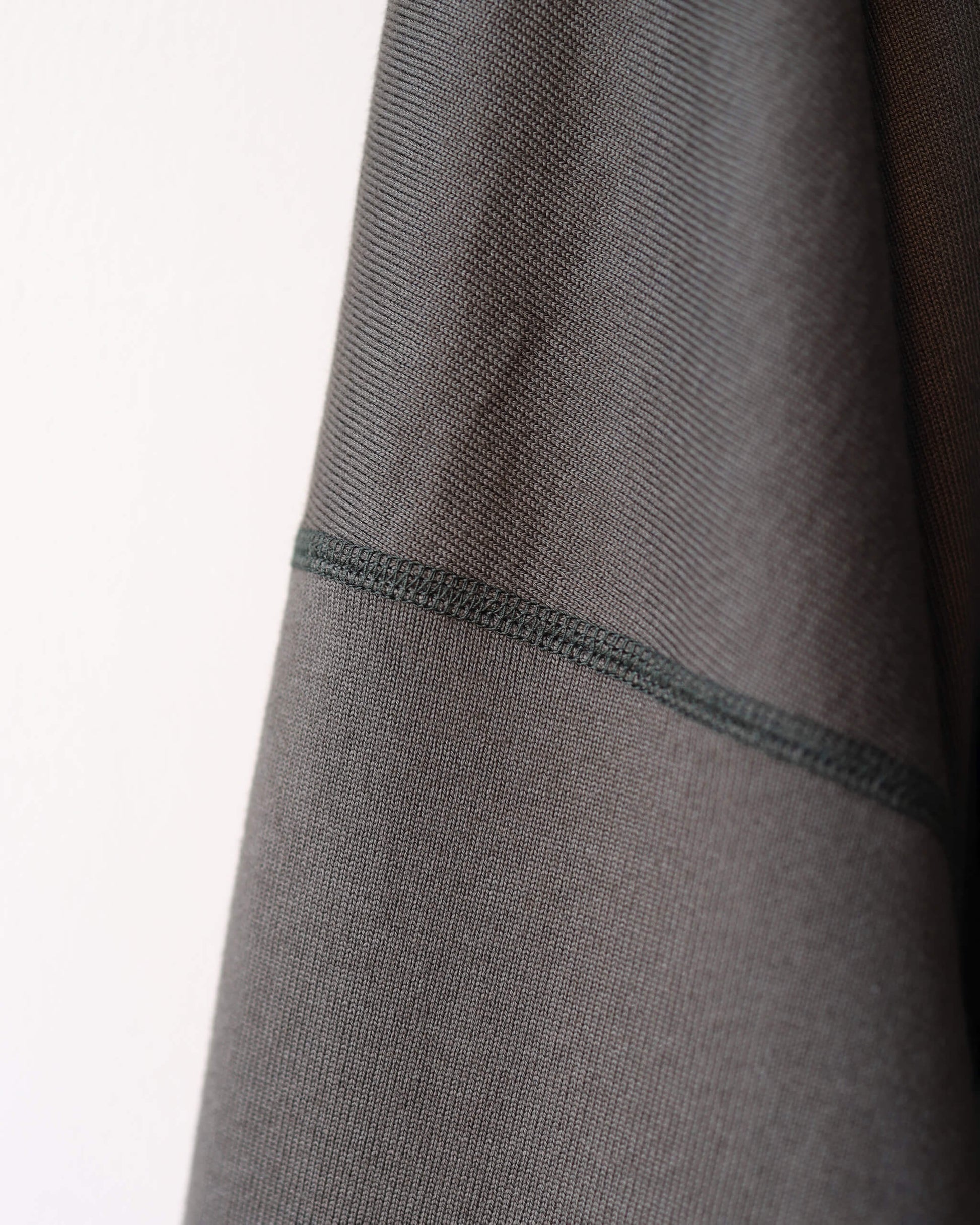 肩のごろつきが無いフラットな縫製、端をはみ出させた袖のリブ付けなど、縫製の仕様や細かなディテールでさりげなくデザインを加えています。