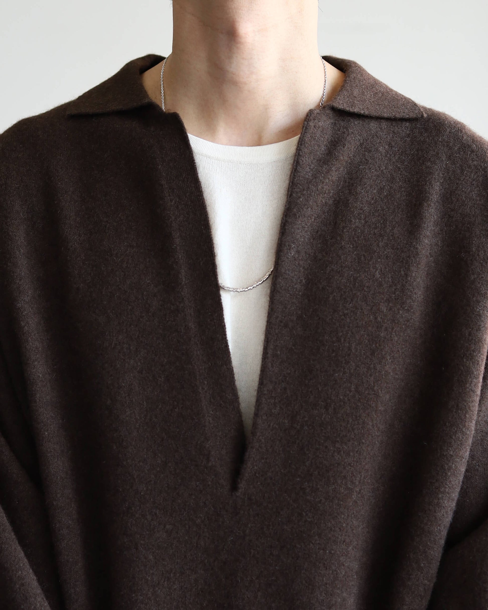 身幅を広めにとり、肩幅をドロップさせ裾にしっかりとテンションのあるリブを配したスウェットのようなボディバランスに、 深めの前立てのあるポロシャツのディテールを加えています。