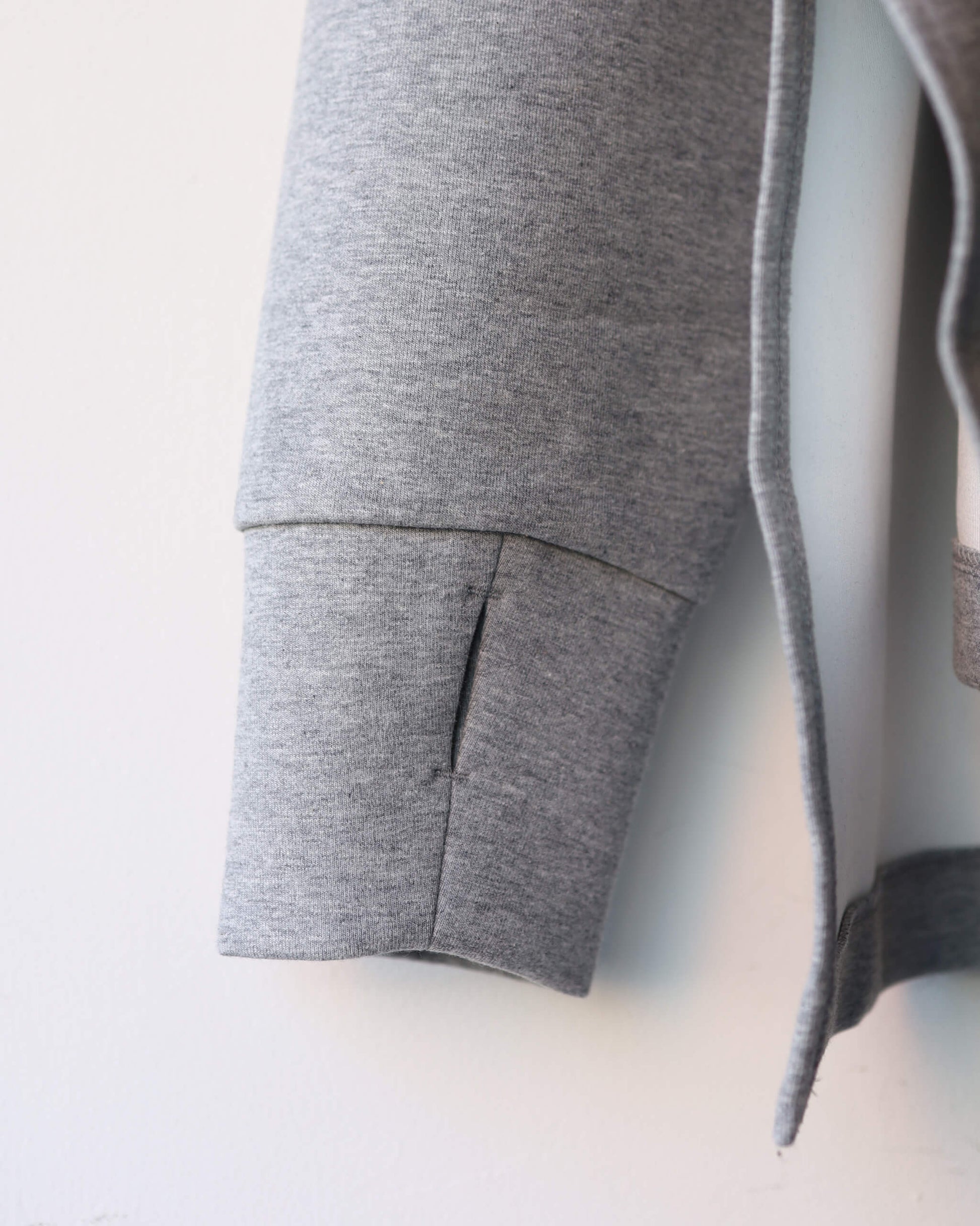 ミニマルでありながら、裾の深いスリット、長めに設定した後ろの着丈、ボリューム感のあるフォルム。弾力があるダンボールニットと相性が良いディテールが盛り込まれています。