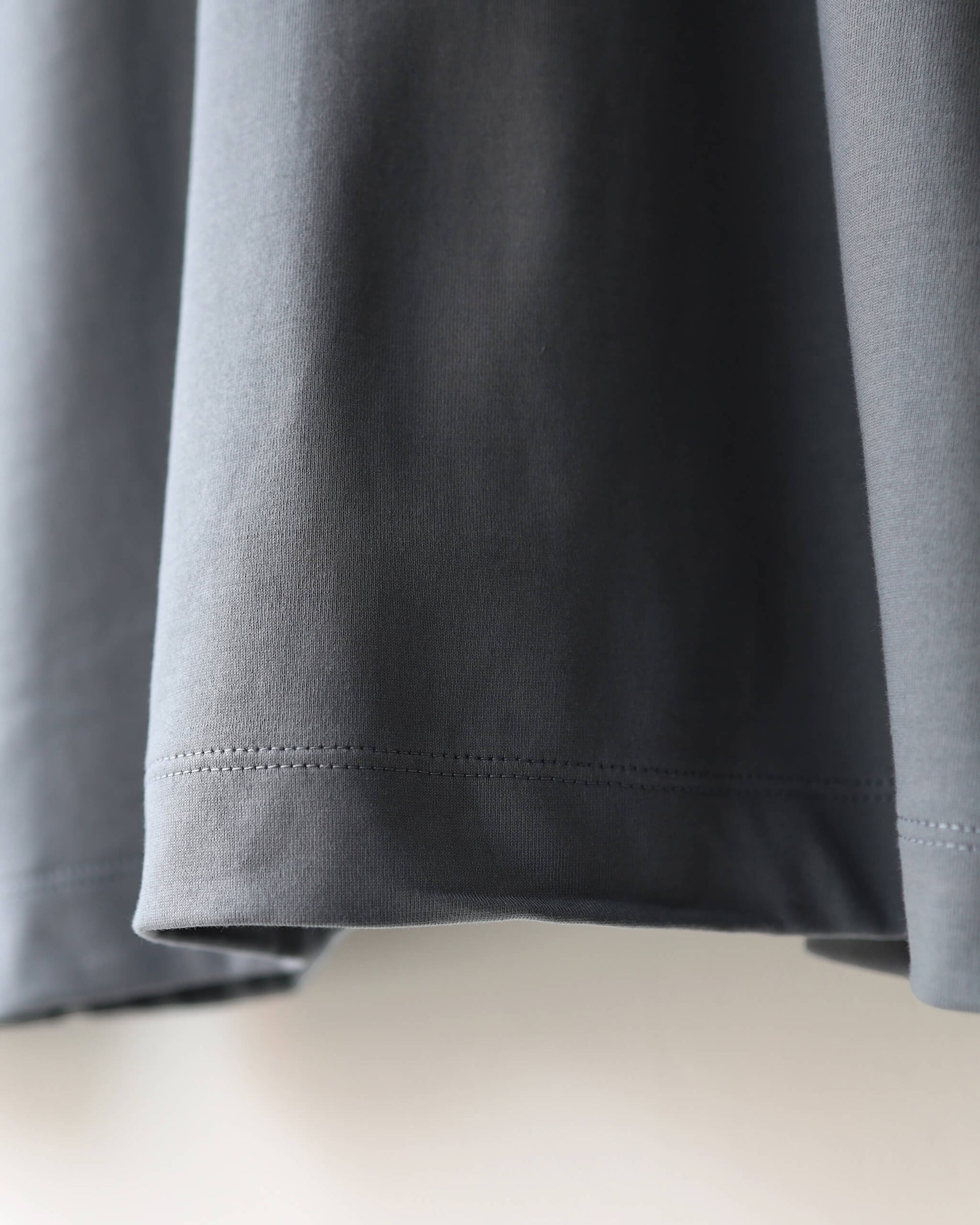 オーガニックギザコットンの3本撚りにより、度詰めでしっかりと編み立てられたこの生地は、肉厚ながらも美しいドレープを描き、優れた手持ち感と高い耐久性を兼ね備えています。