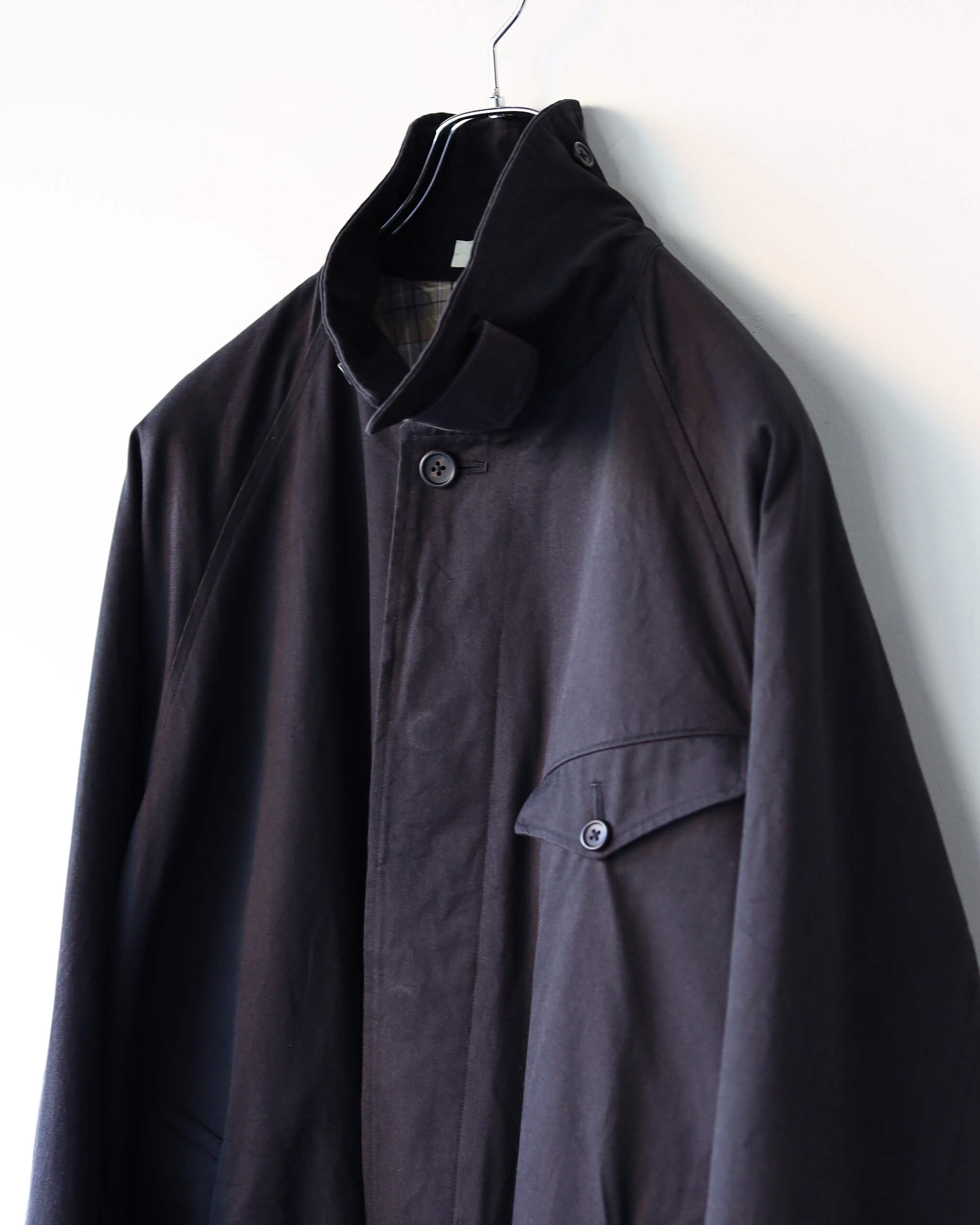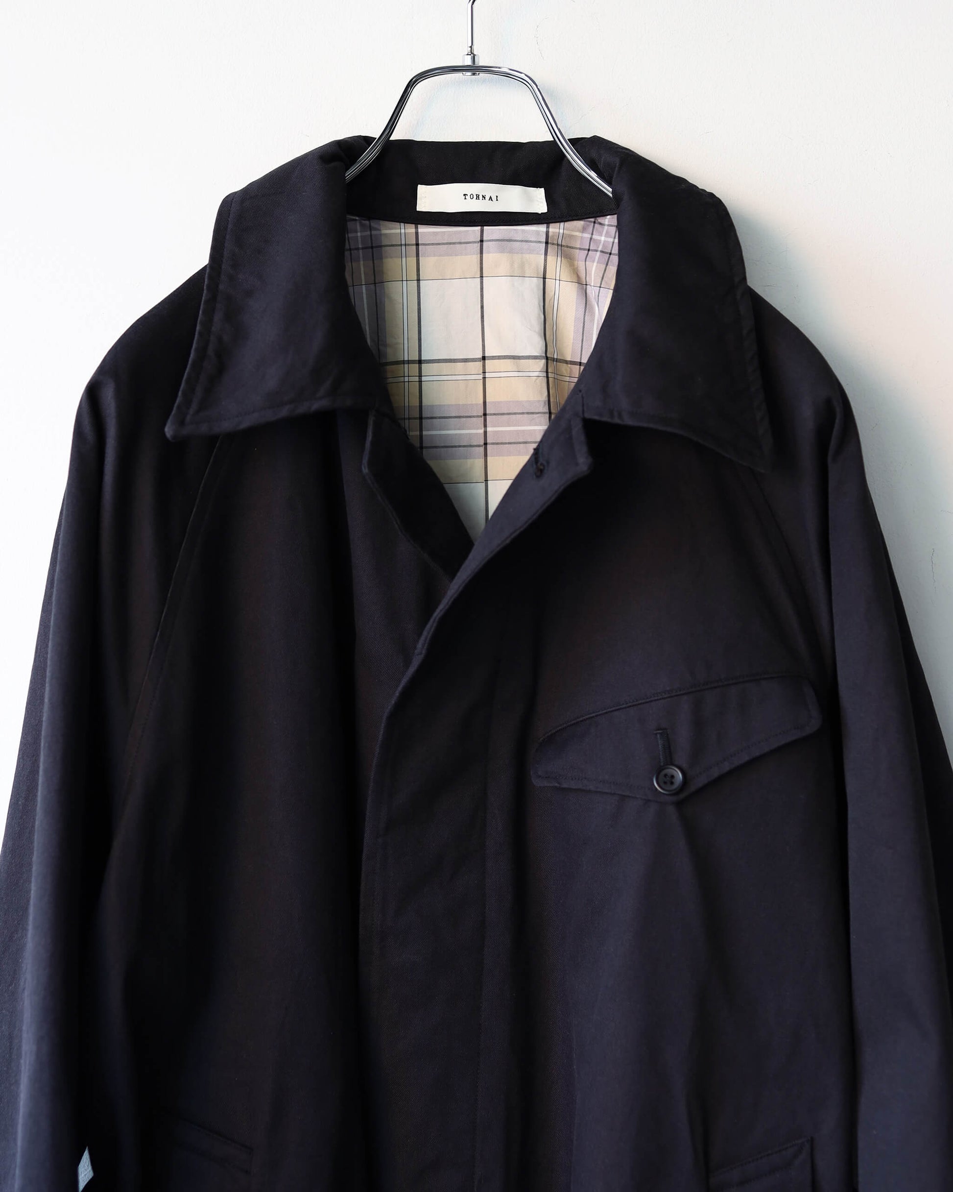 TOHNAI のアイコン的なディテールである胸のポケット、エレガントな後ろ姿を演出するアンブレラヨークが特徴です。