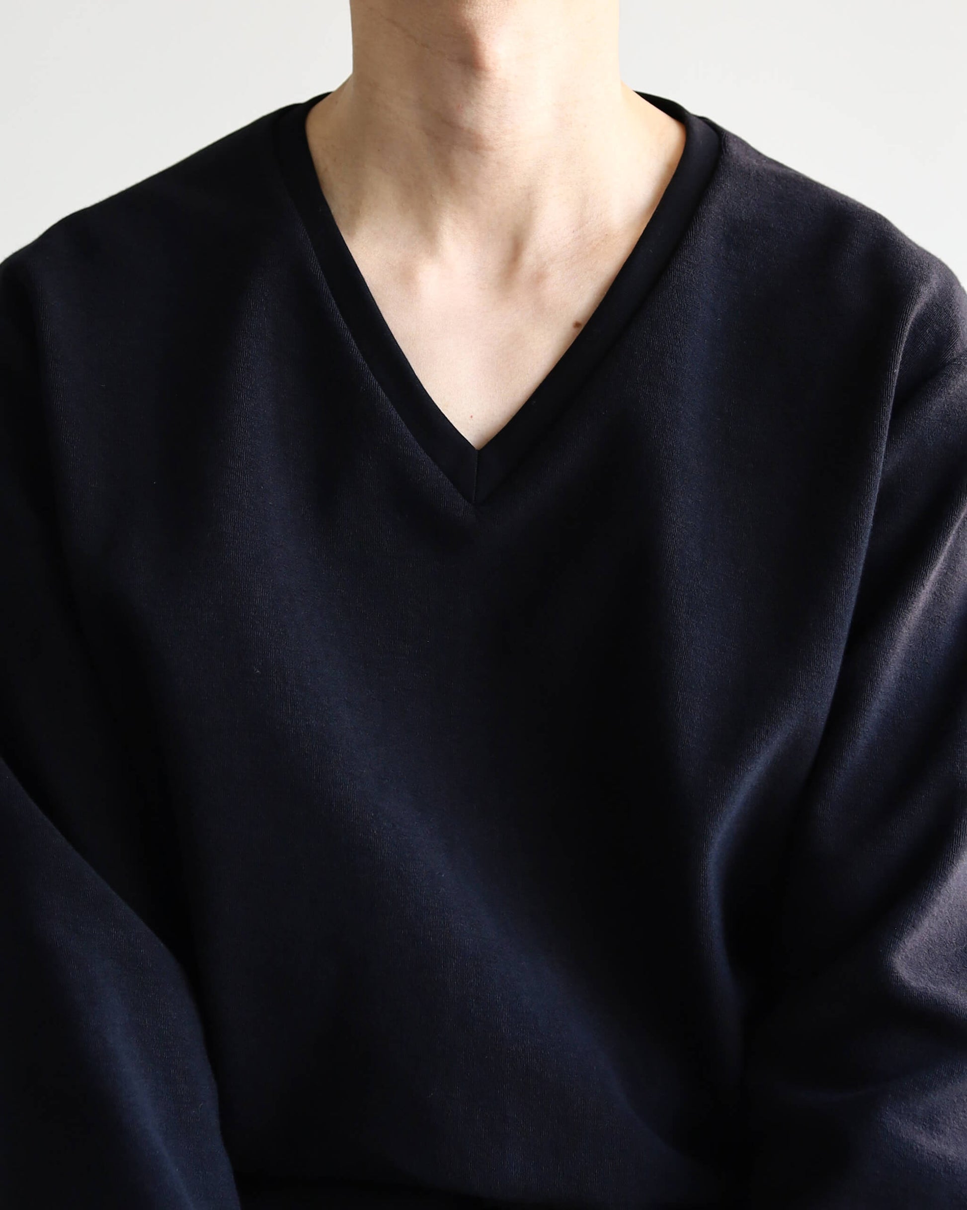 Vネックの形状は、やや鋭く色気のある首周りを演出しつつ、インナーなしでもギリギリ許される深さに設定していただきました。マットな黒の色味、程よくリラックスしたシルエット、素材の持つ柔らかな膨らみにより、いやらしさを感じさせません。