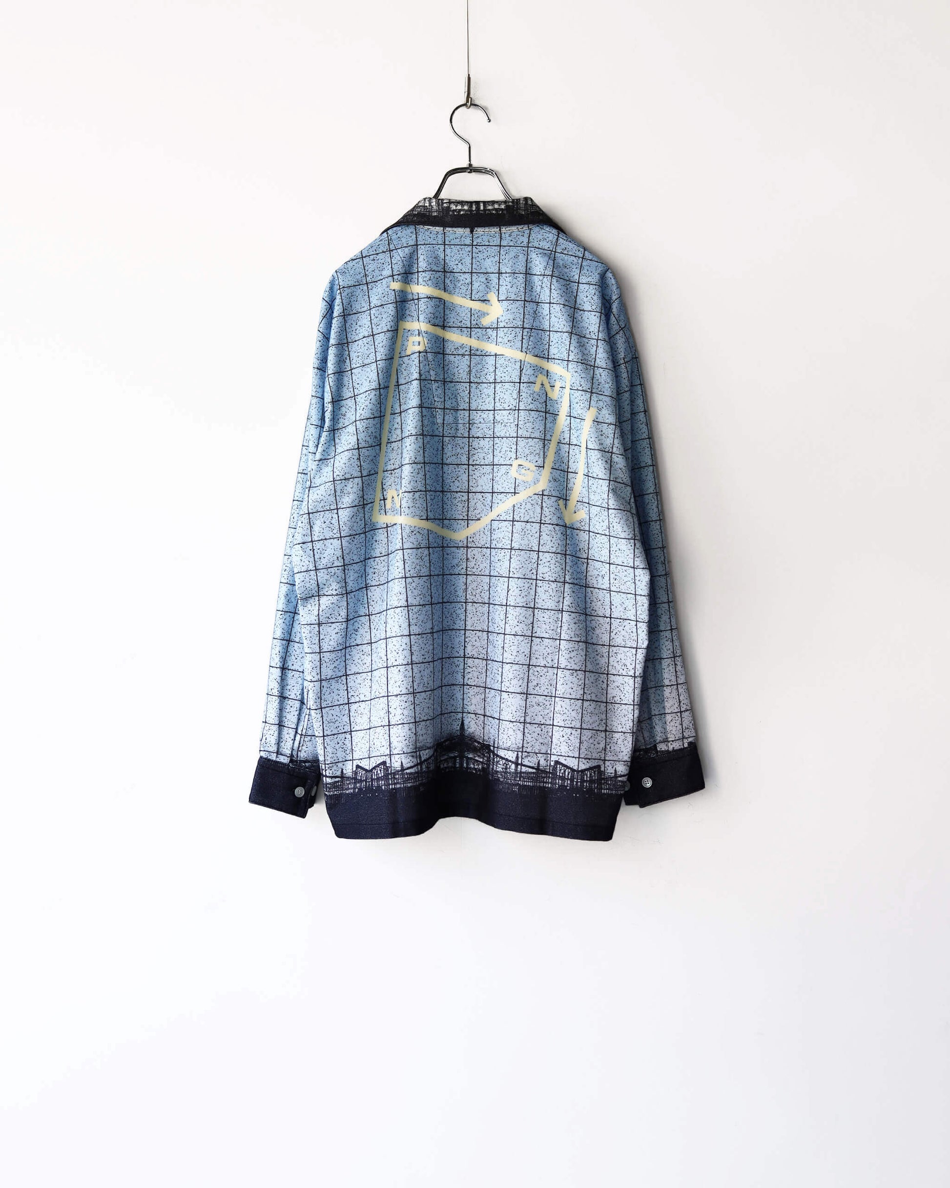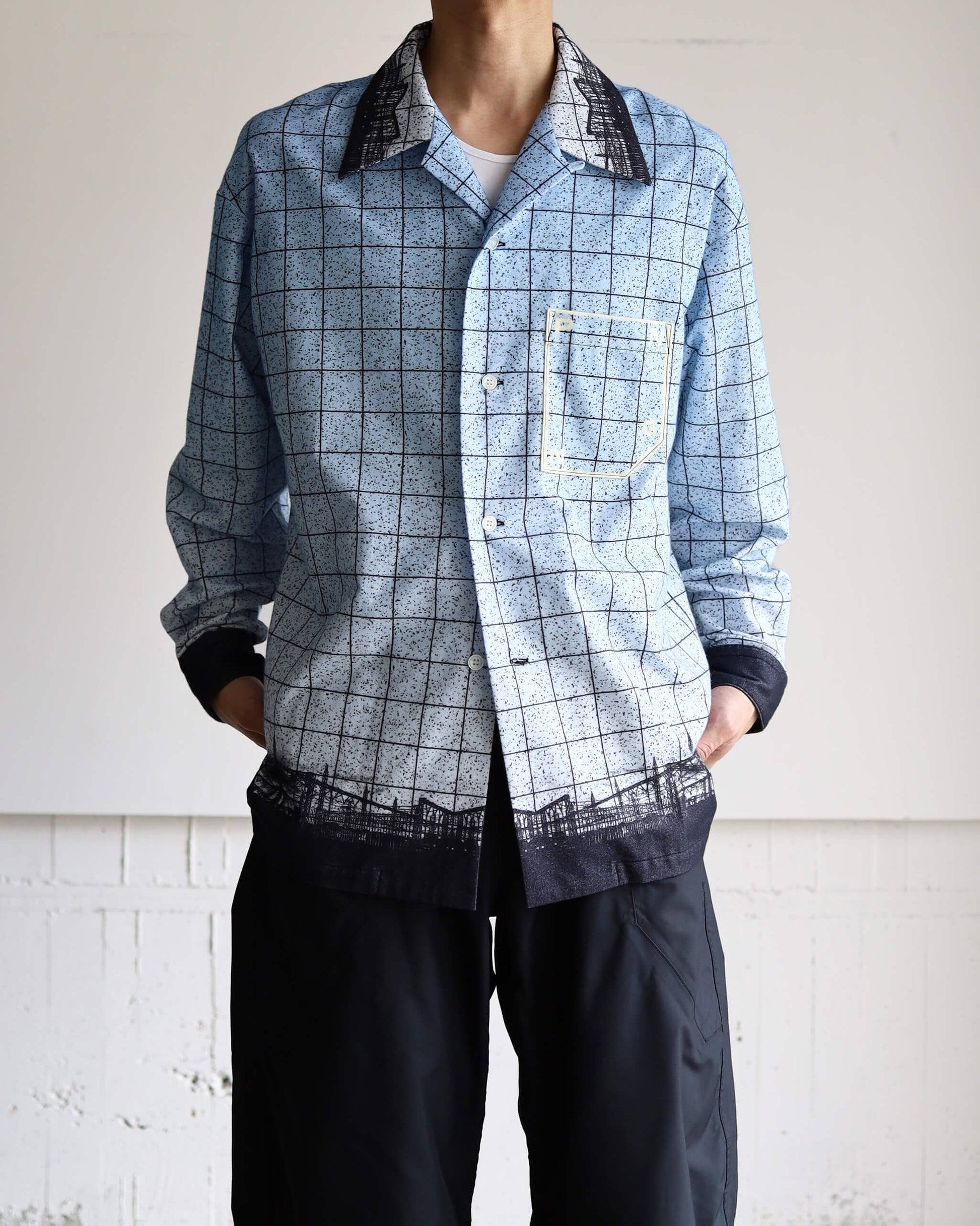 青空と哀愁感漂う景色のグラフィックがプリントされたオープンカラーネルシャツ。