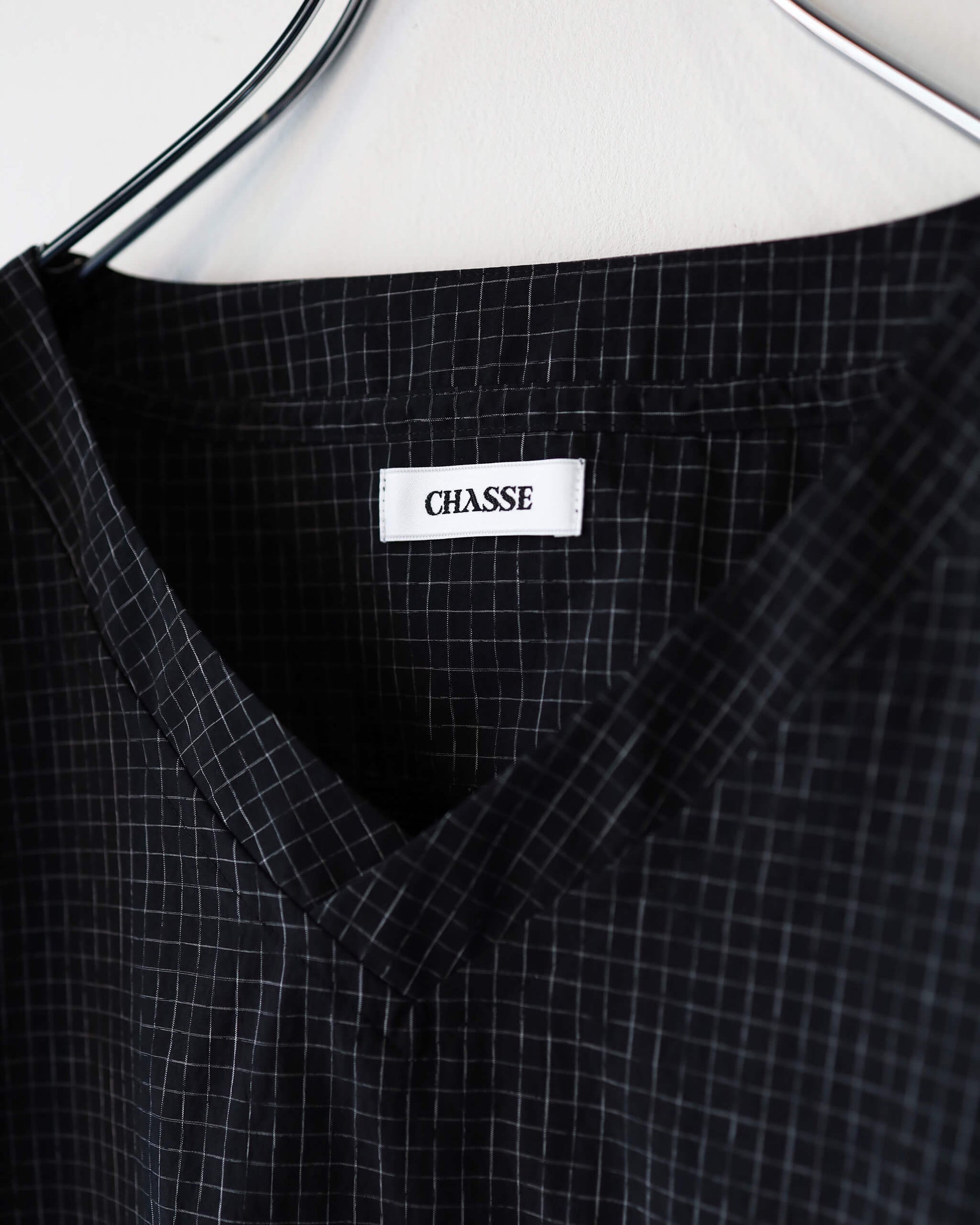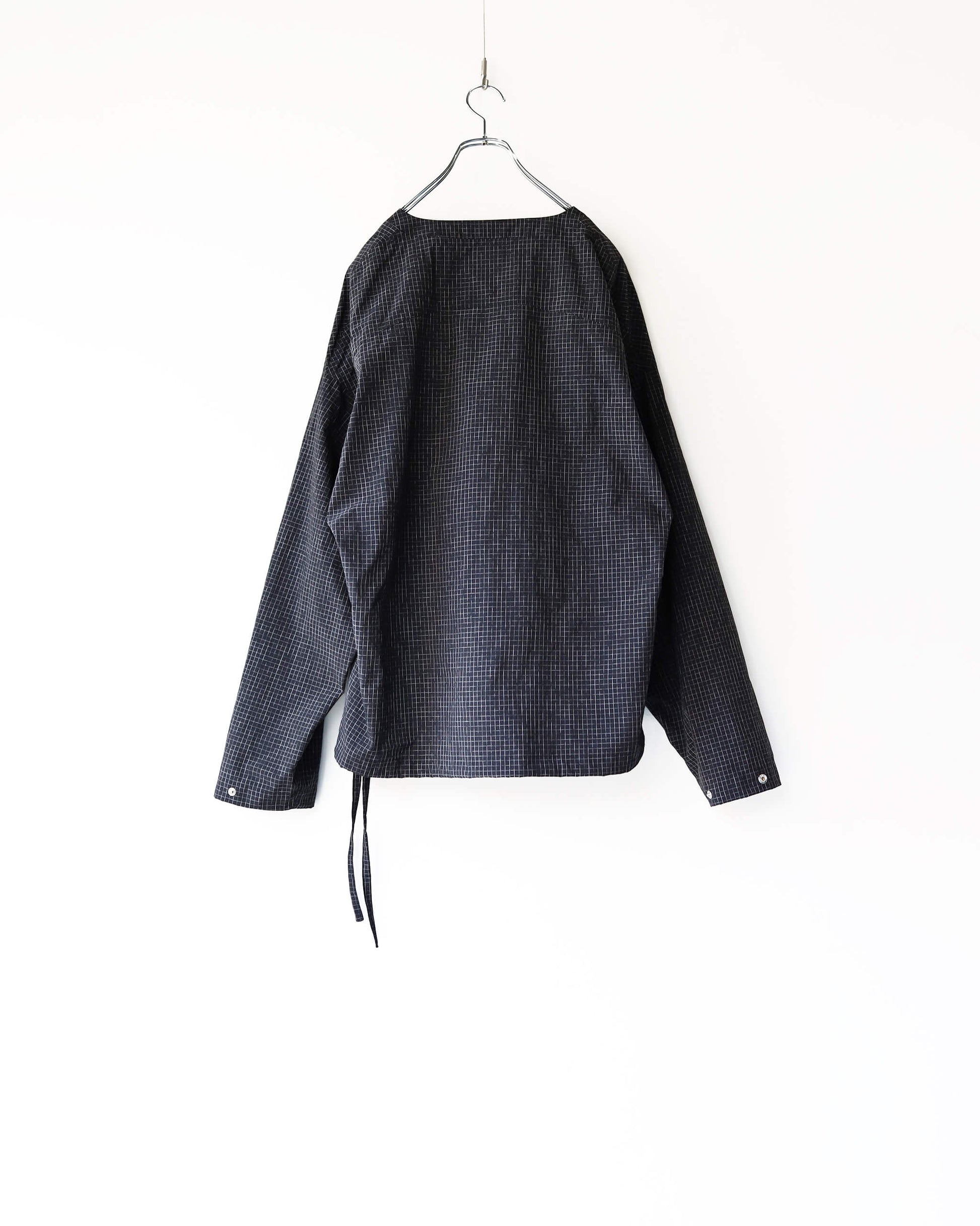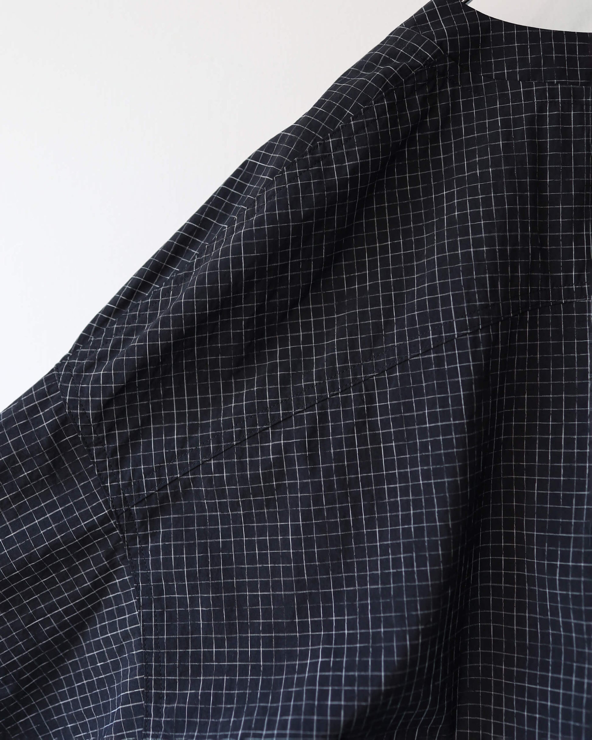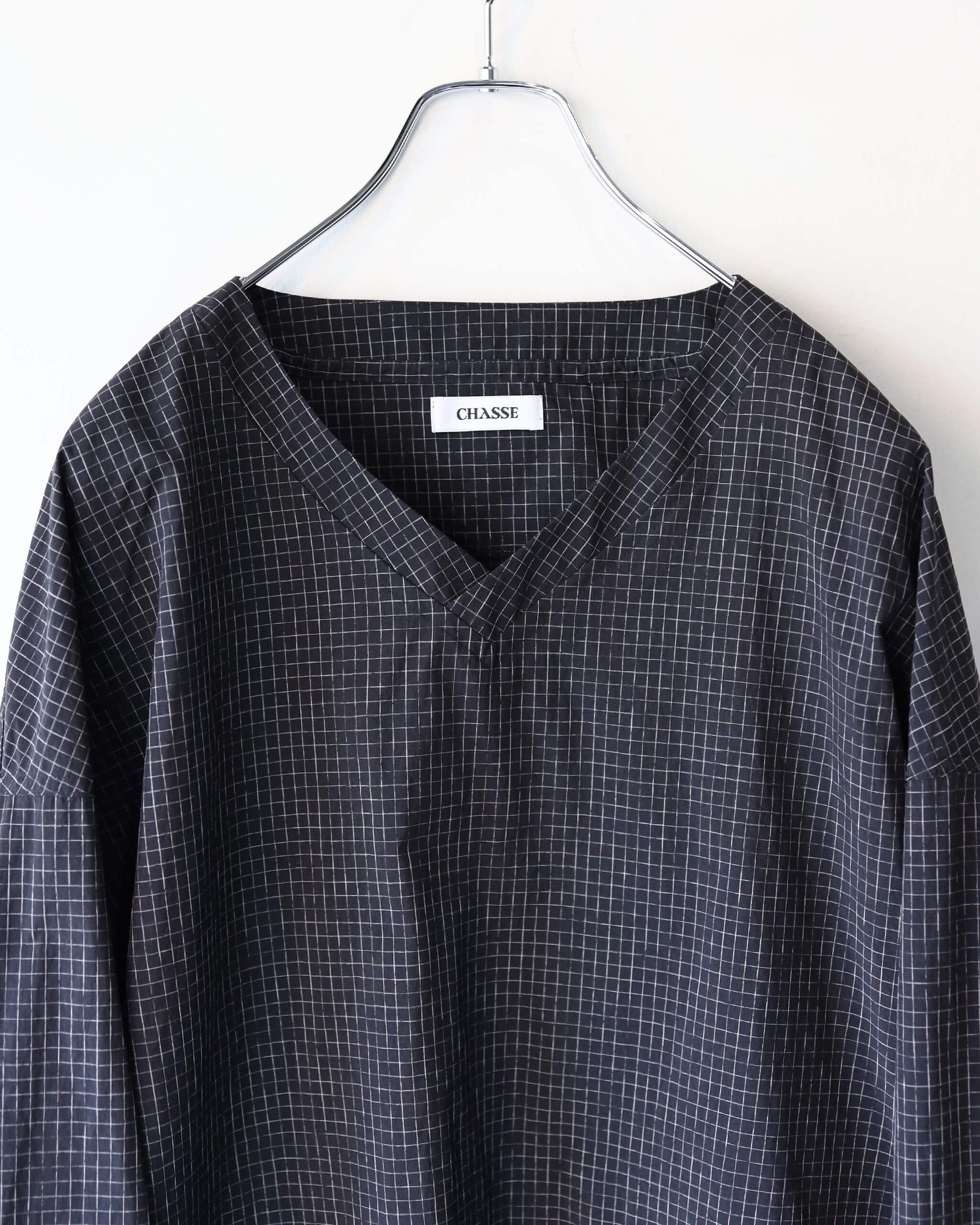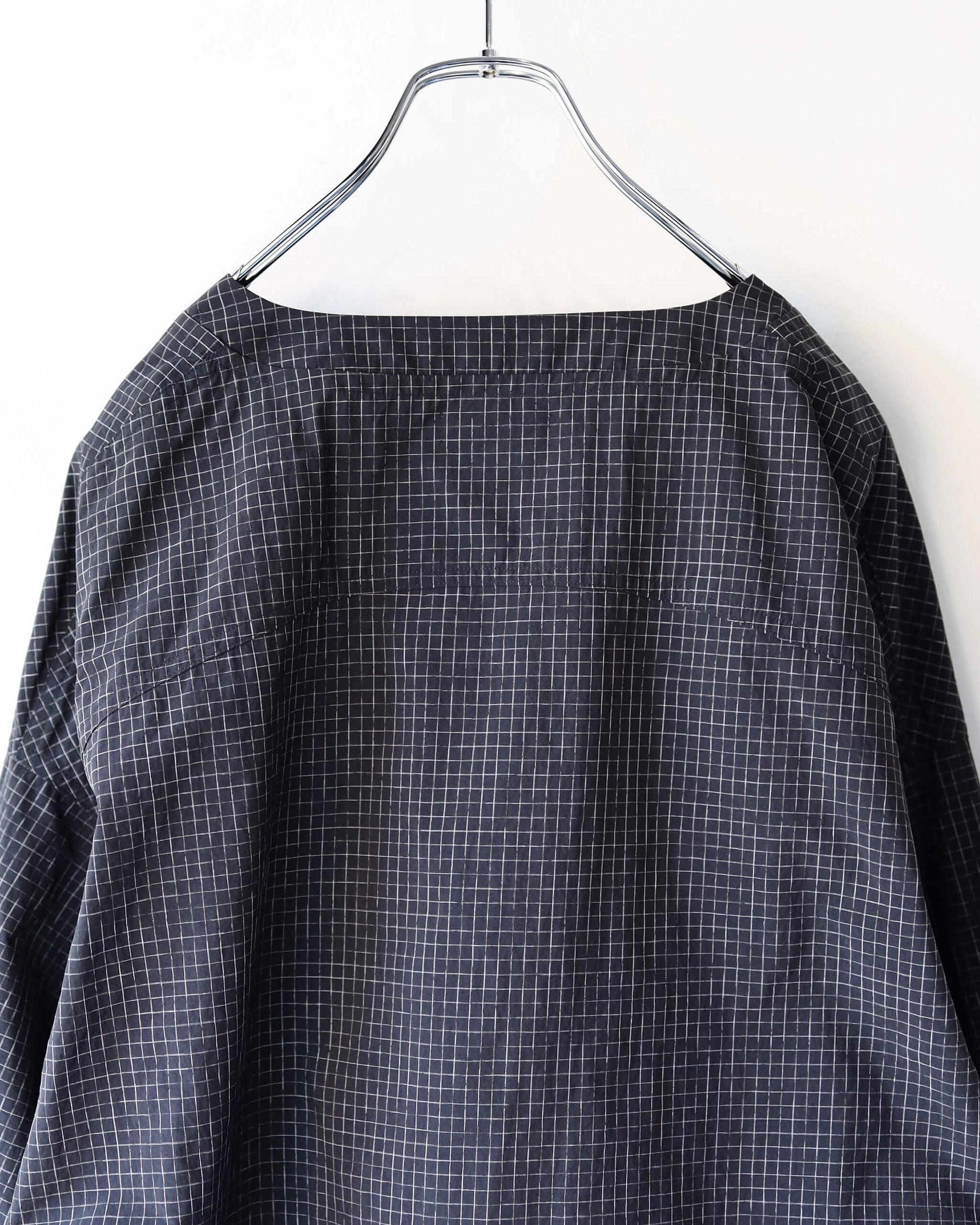 新しい空気感の首の開きと細かなチェック柄が特徴です。