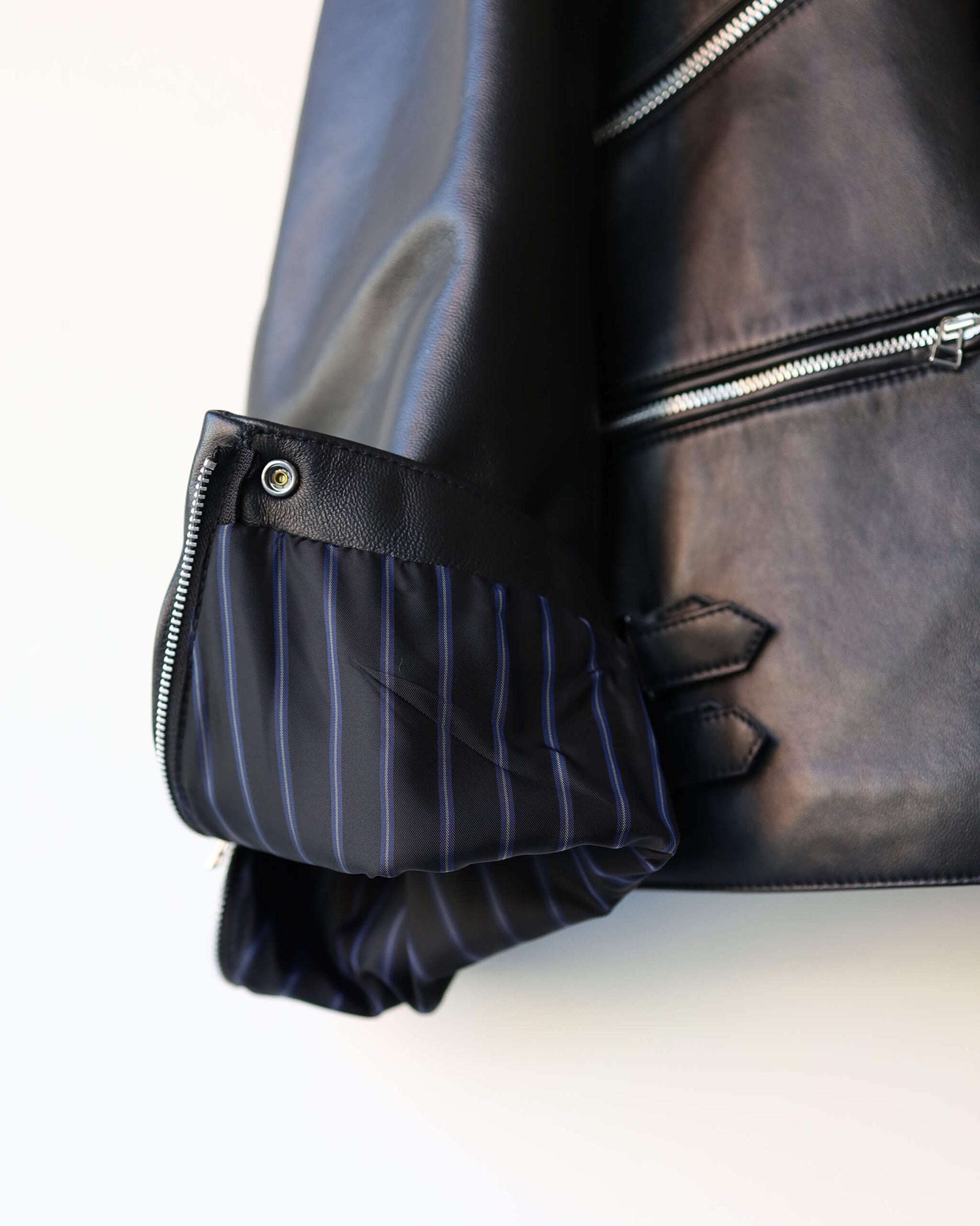 ダブルライダースのようなルックス、スタンドカラーにもなる襟の仕様、フラシのポケットなど、同ブランドらしい要素がふんだんに盛り込まれた1着。