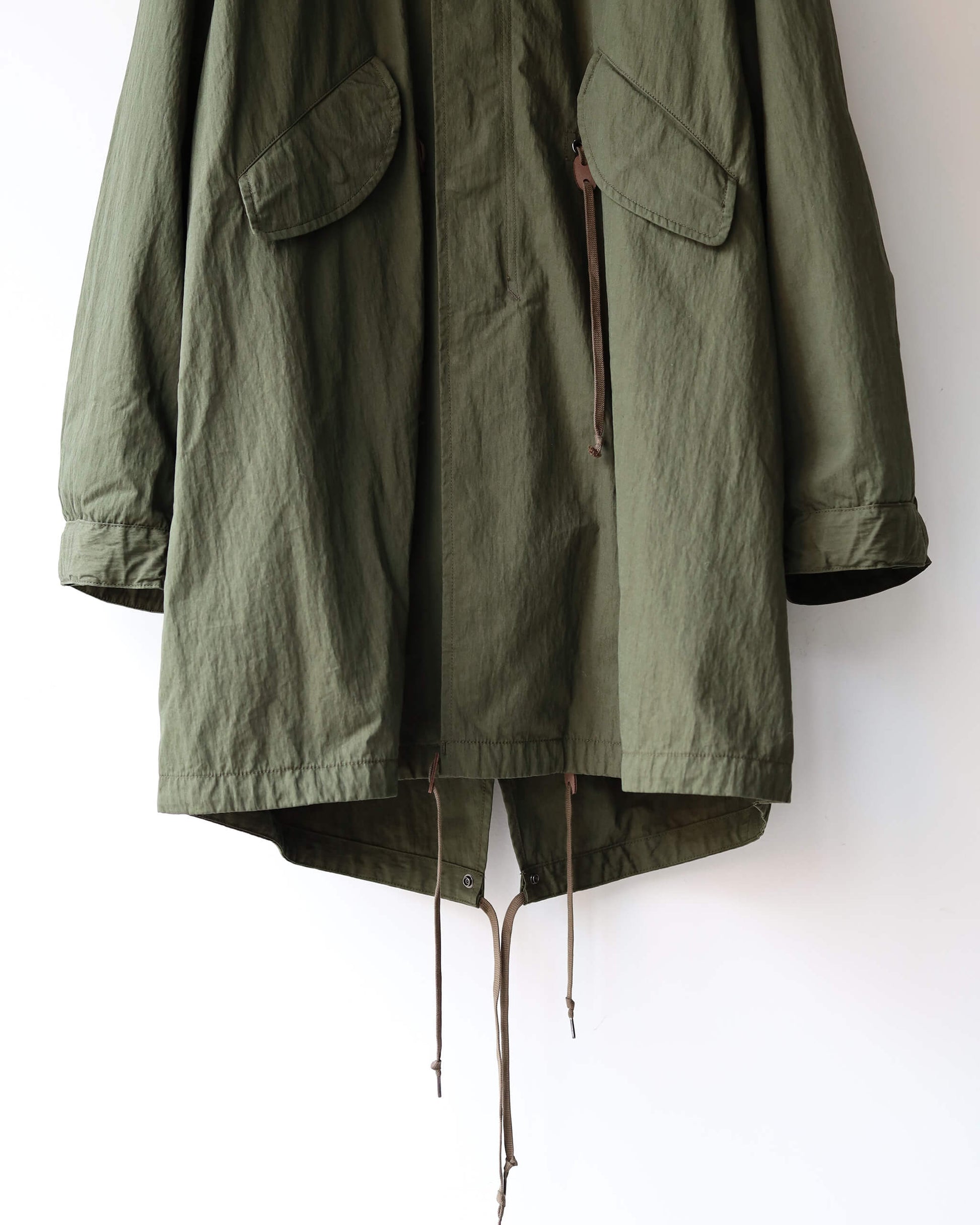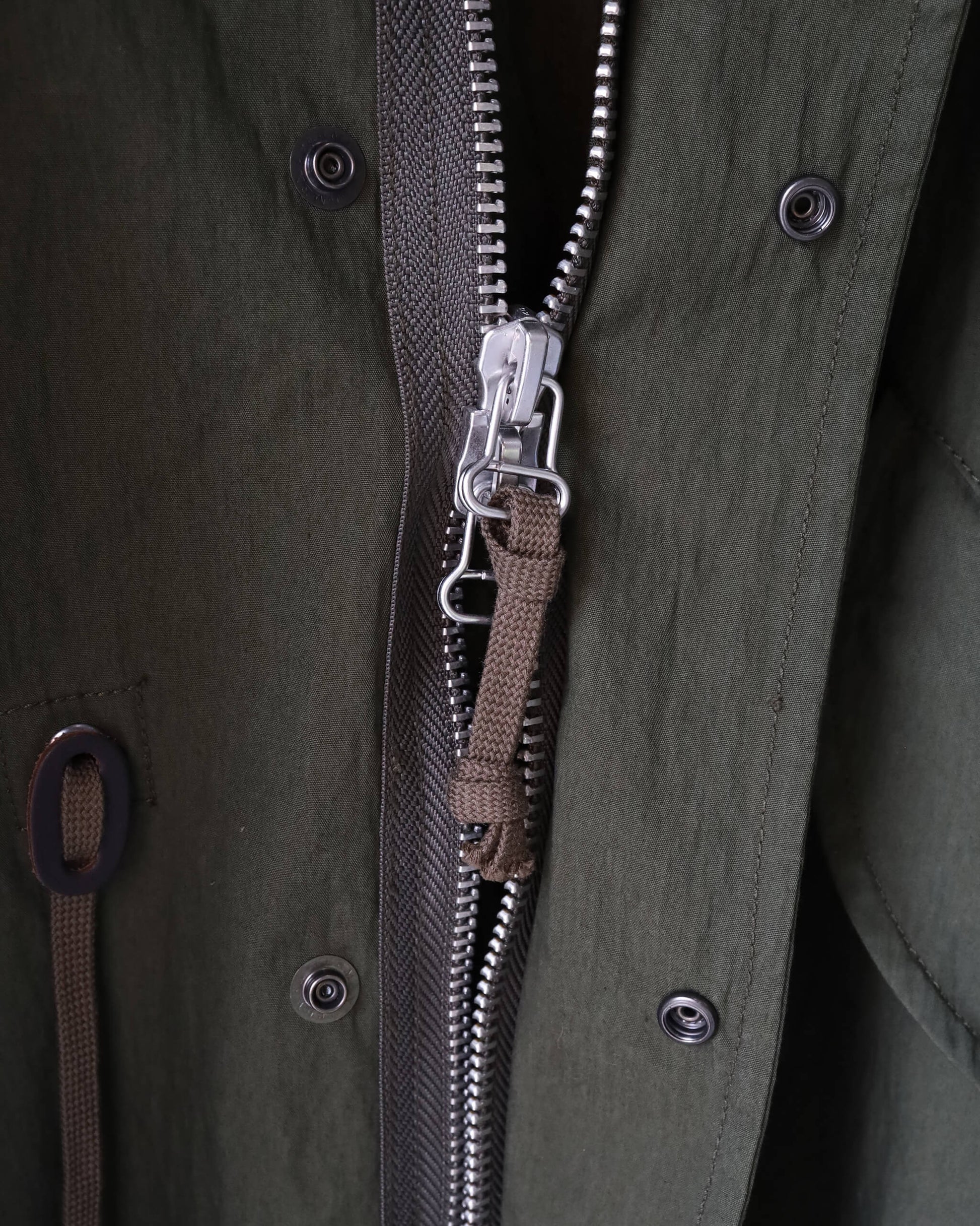表地にはヴィンテージのミリタリーウェアを元に再現した、コットンナイロンクロスを二浴染めした国産素材。