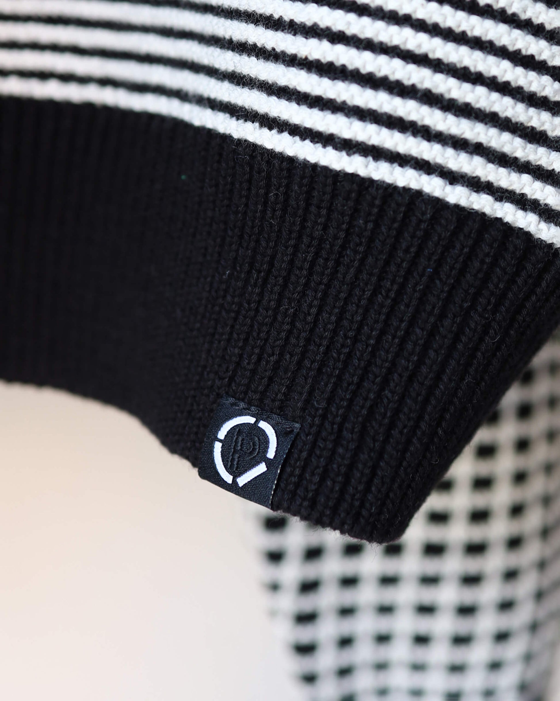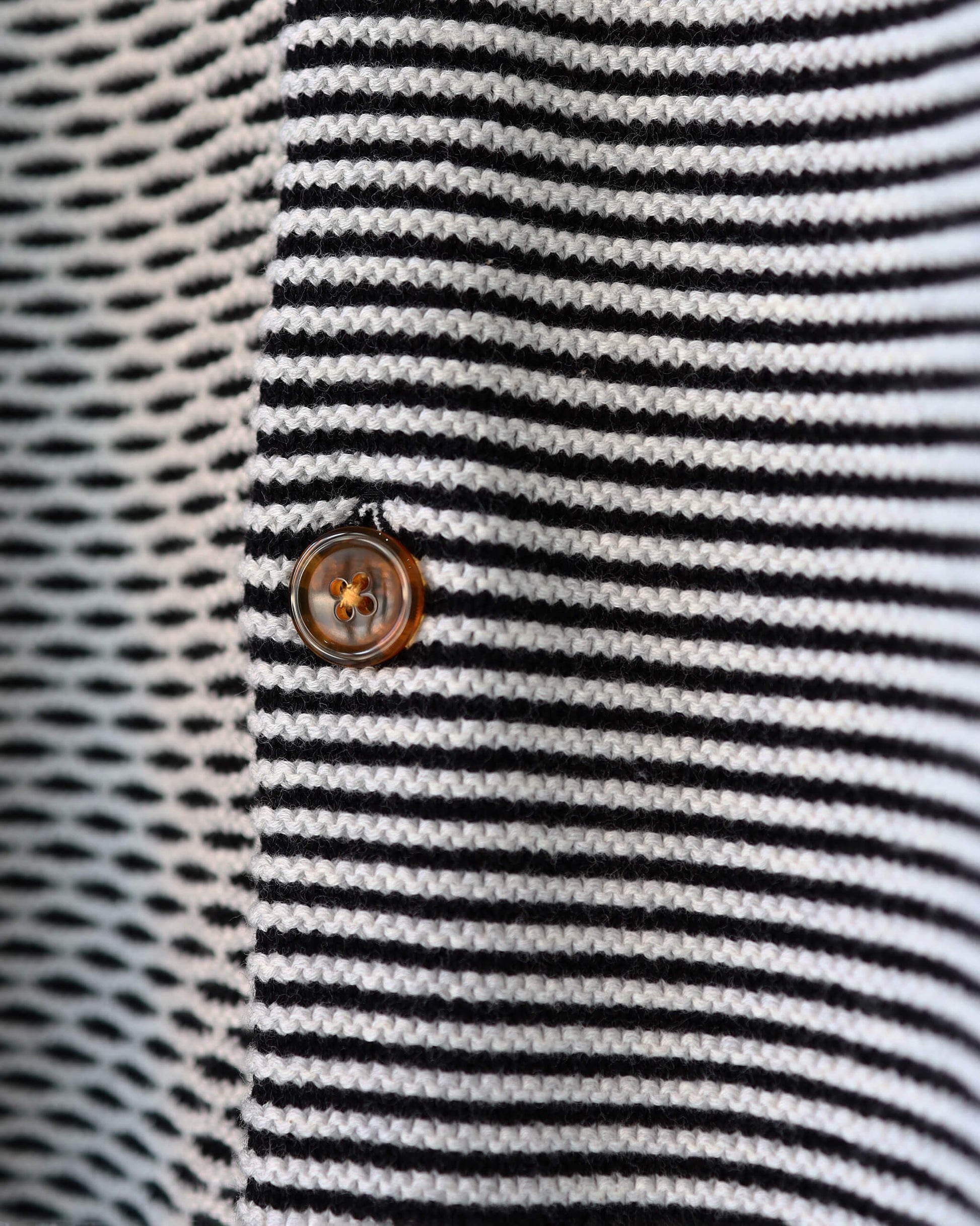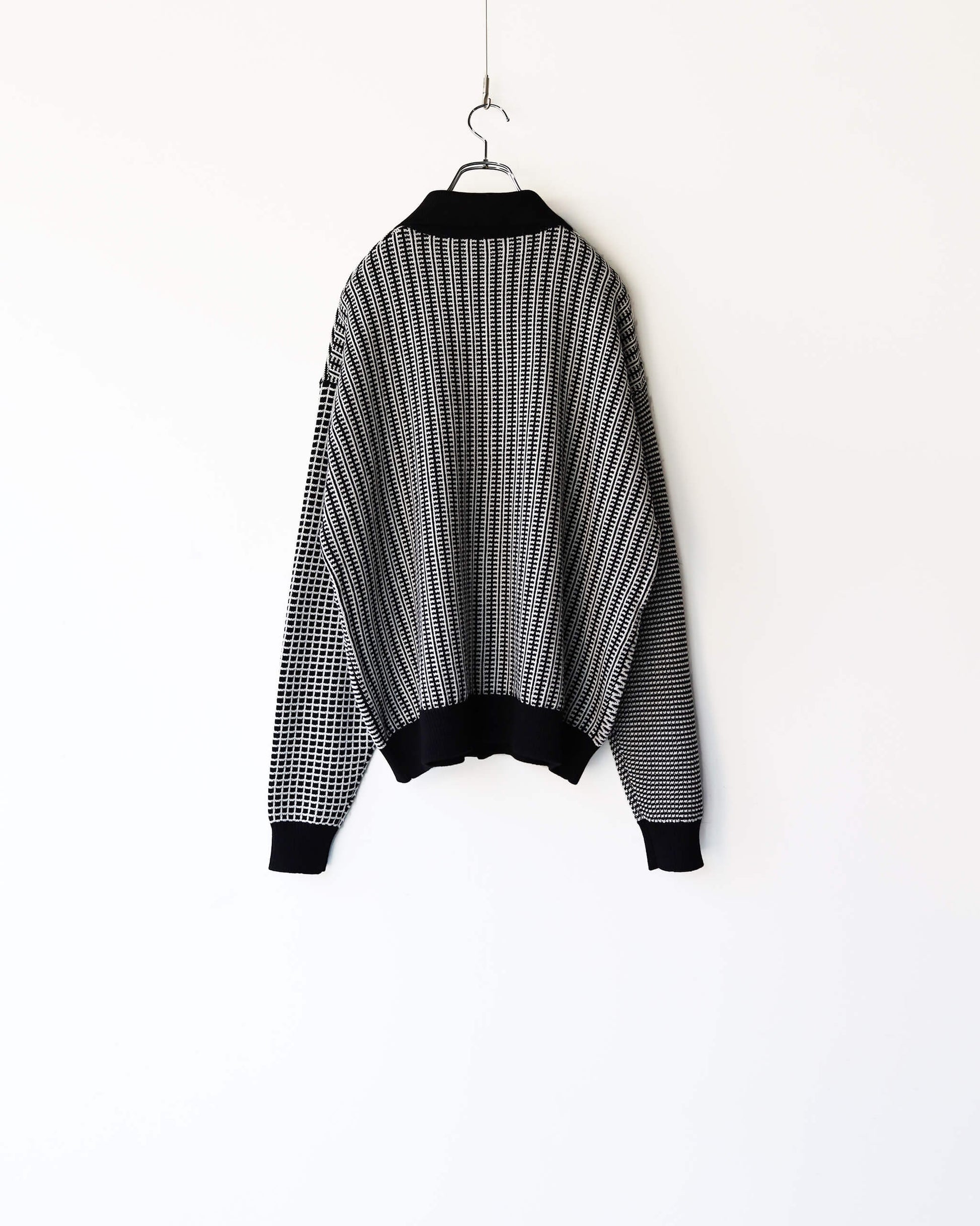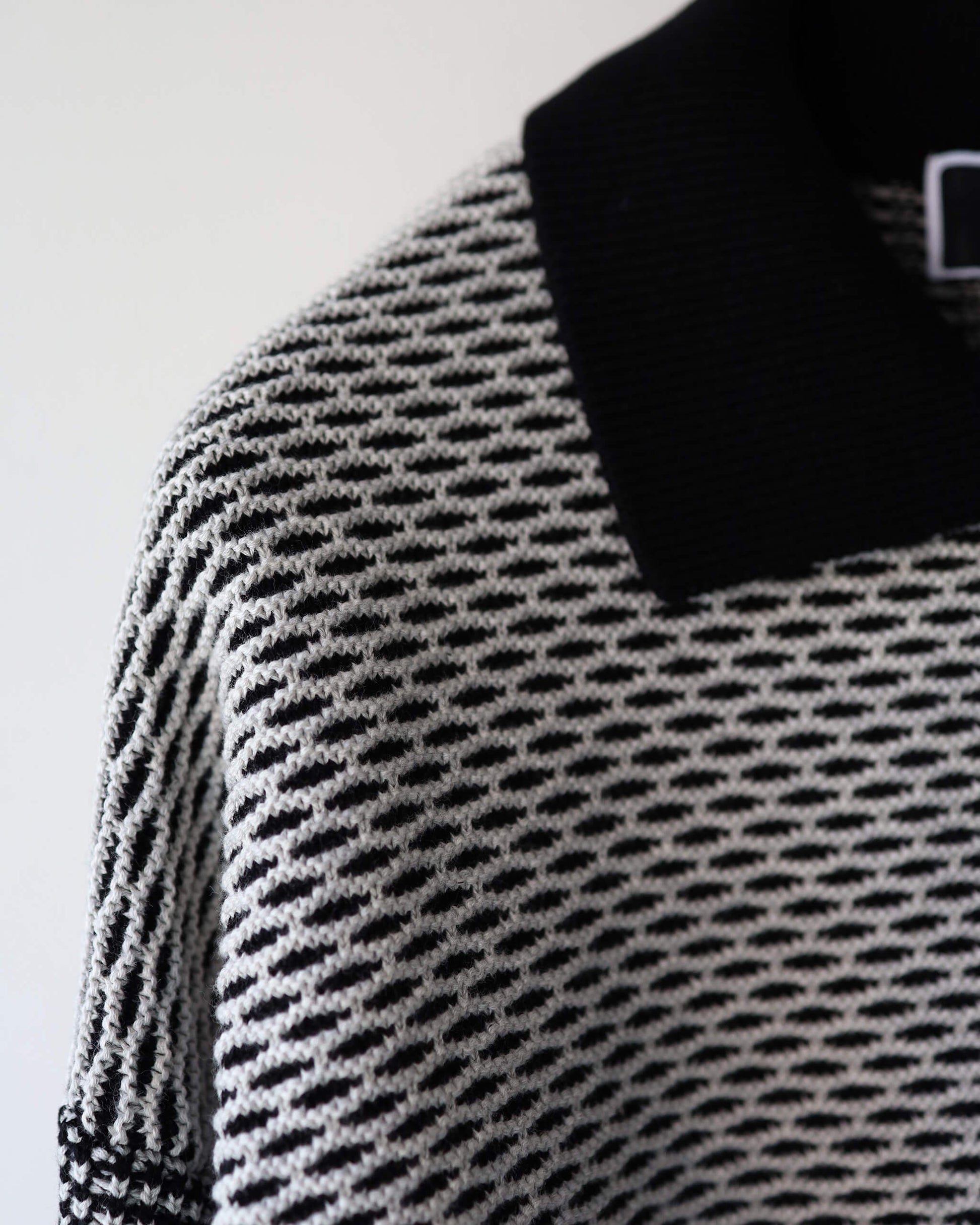 同糸で網目の違うニット地をパネルごとで切り替えたニットシャツ。
