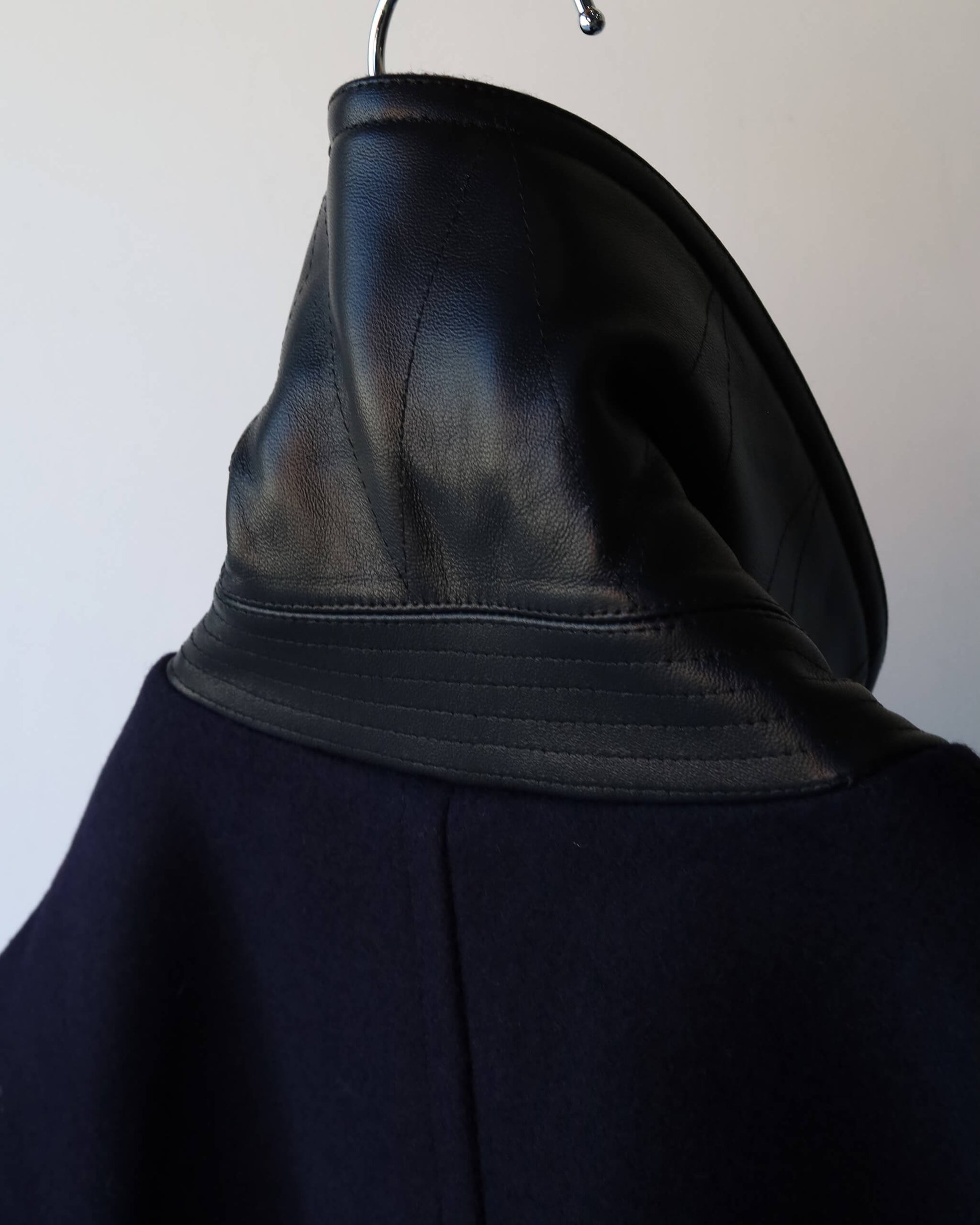 襟裏にラムレザー。襟のボタンを留め、スタンドカラーとしての着用も可能です。