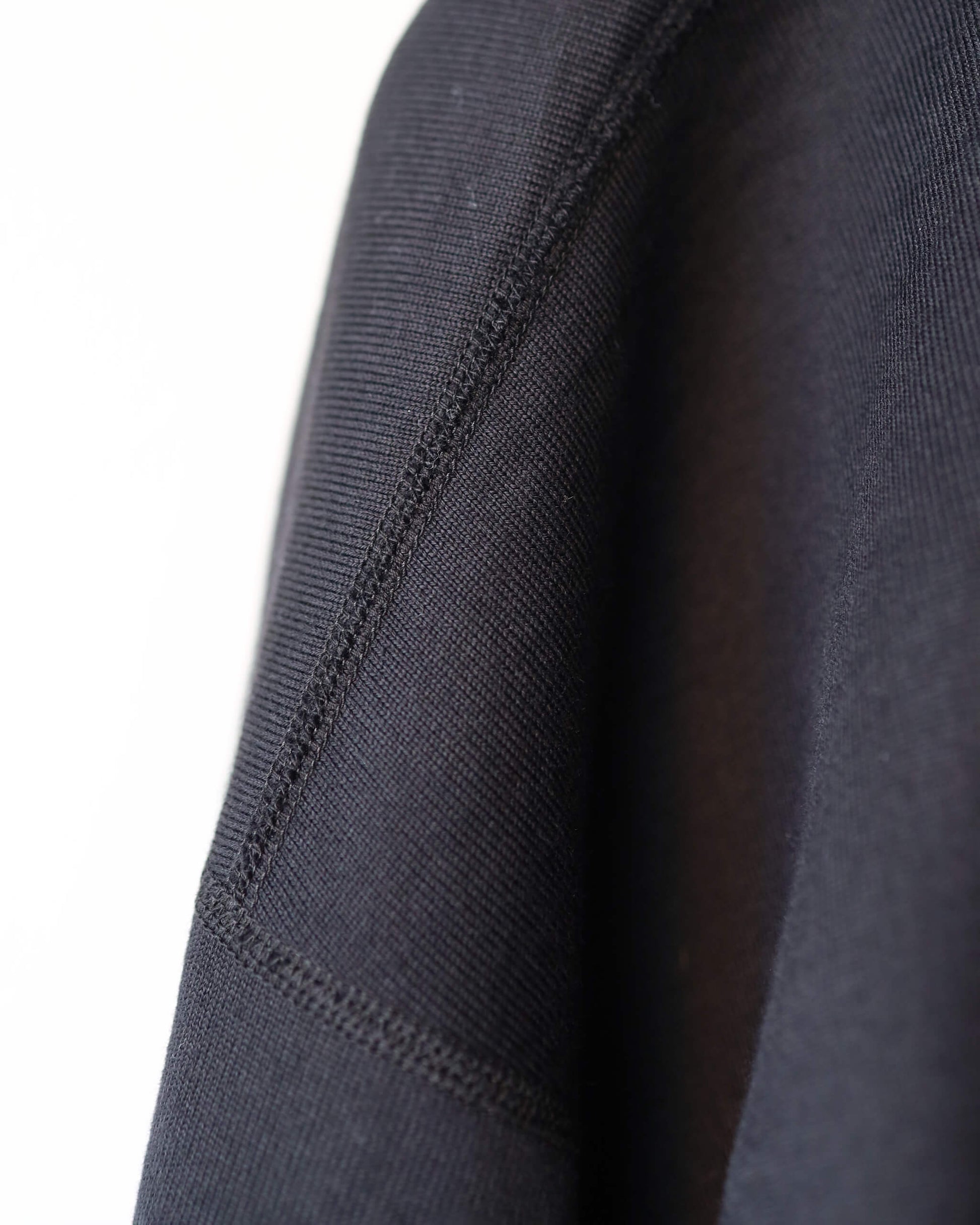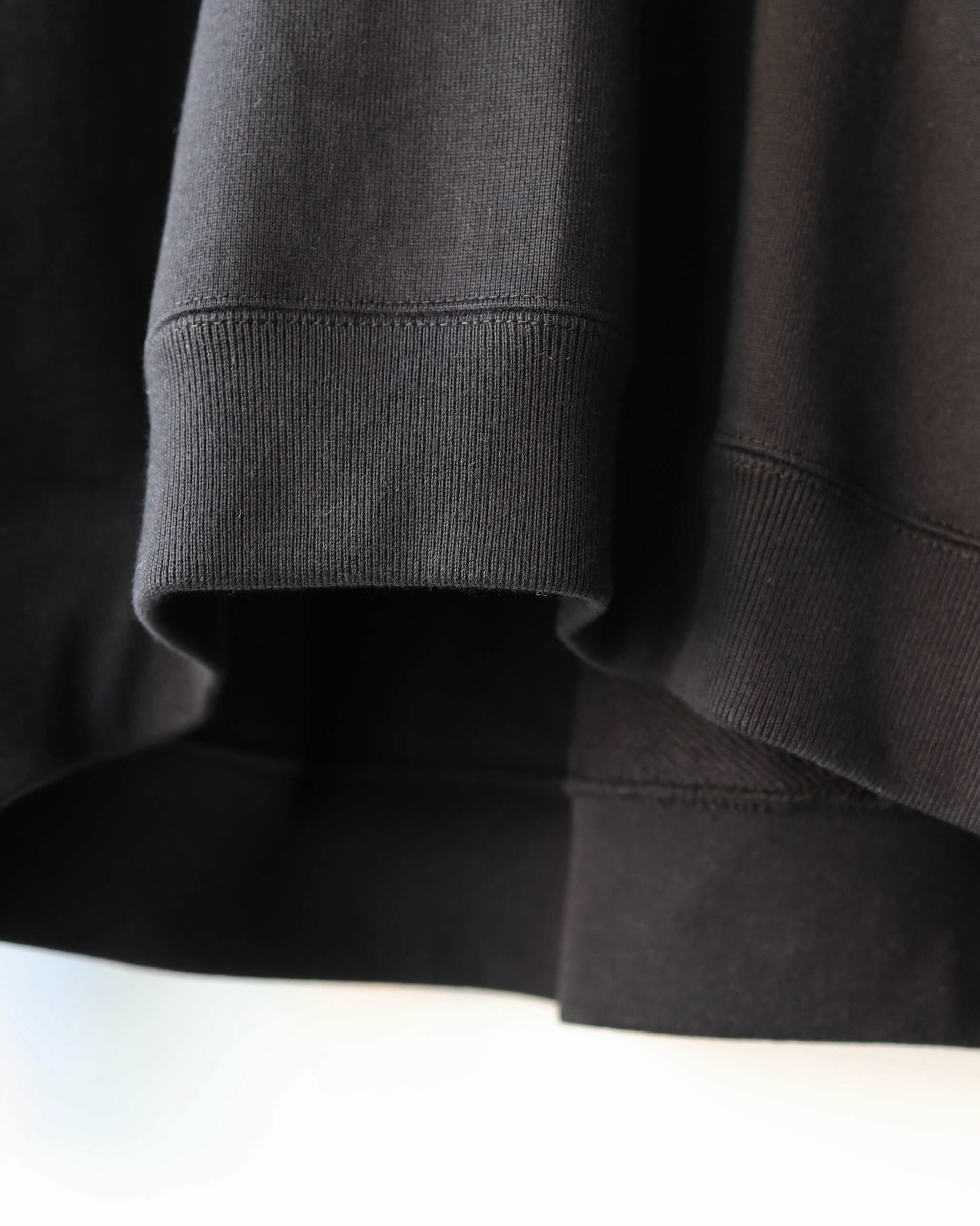 肩のごろつきが無いフラットな縫製、端をはみ出させた袖のリブ付けなど、縫製の仕様や細かなディテールがさりげないアクセントに。
