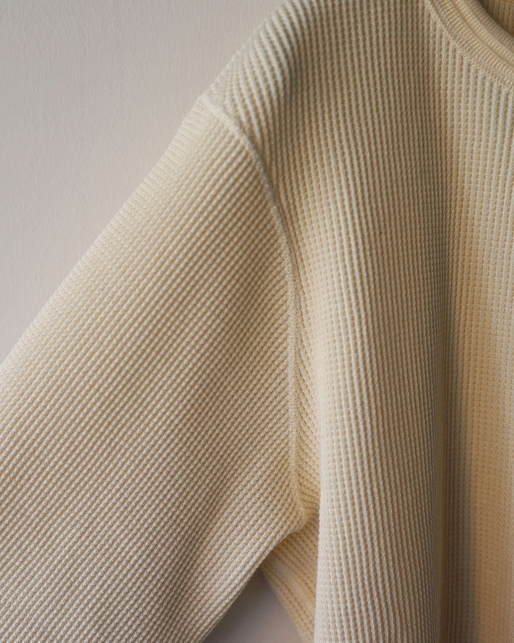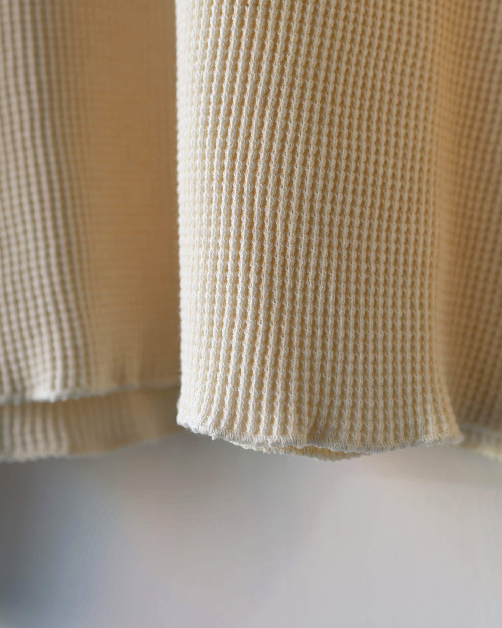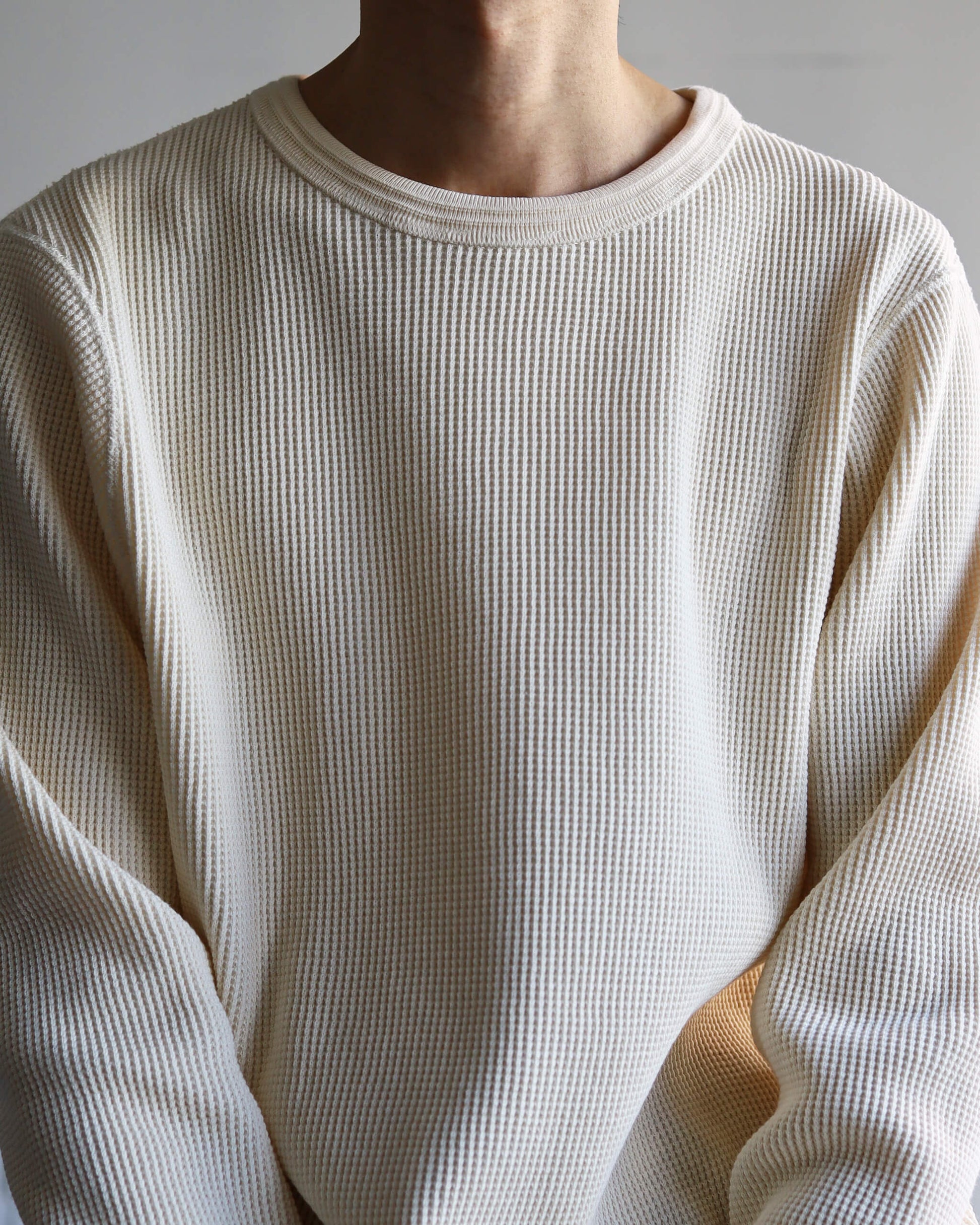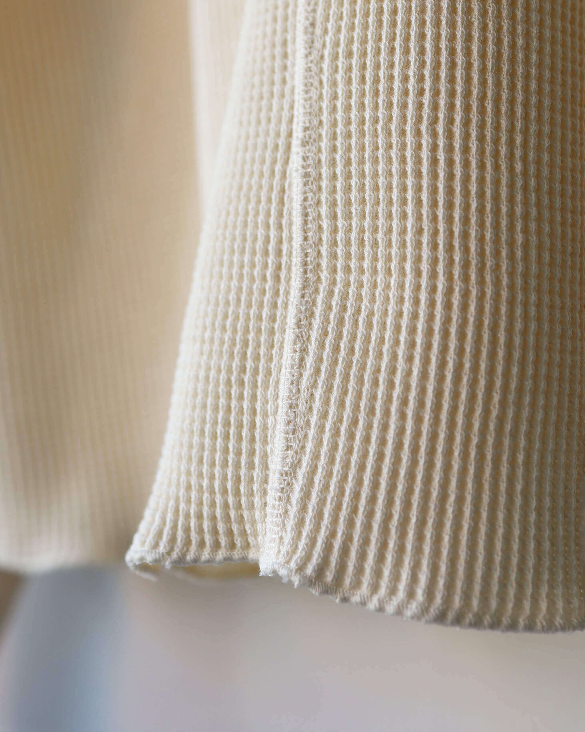 コットンワッフルにおける理想を追求し、番手から設計された引き揃え糸によって、目の立ち方・保温性・耐久性・肌あたりのすべてにおいて最適解を導き出した1枚です。