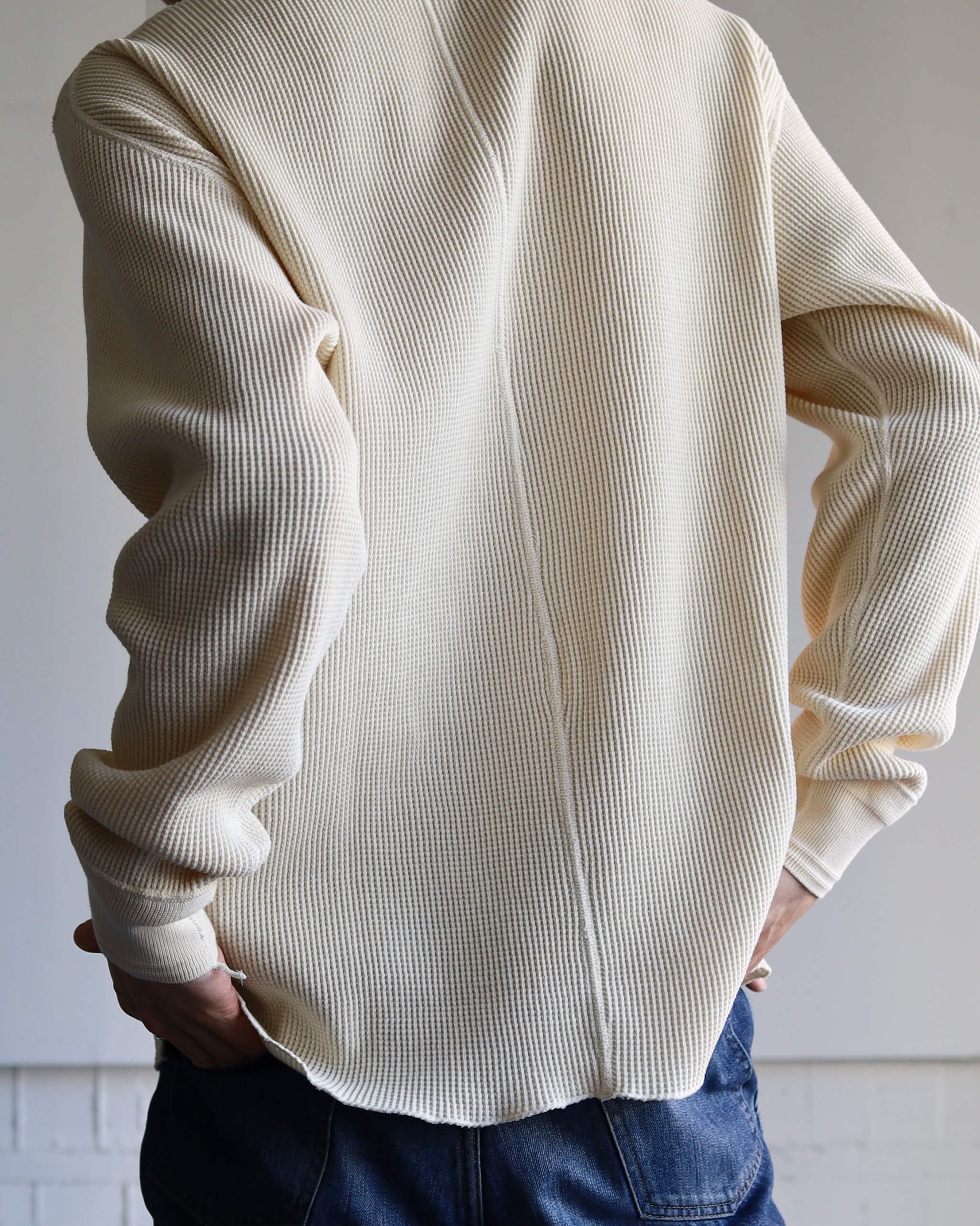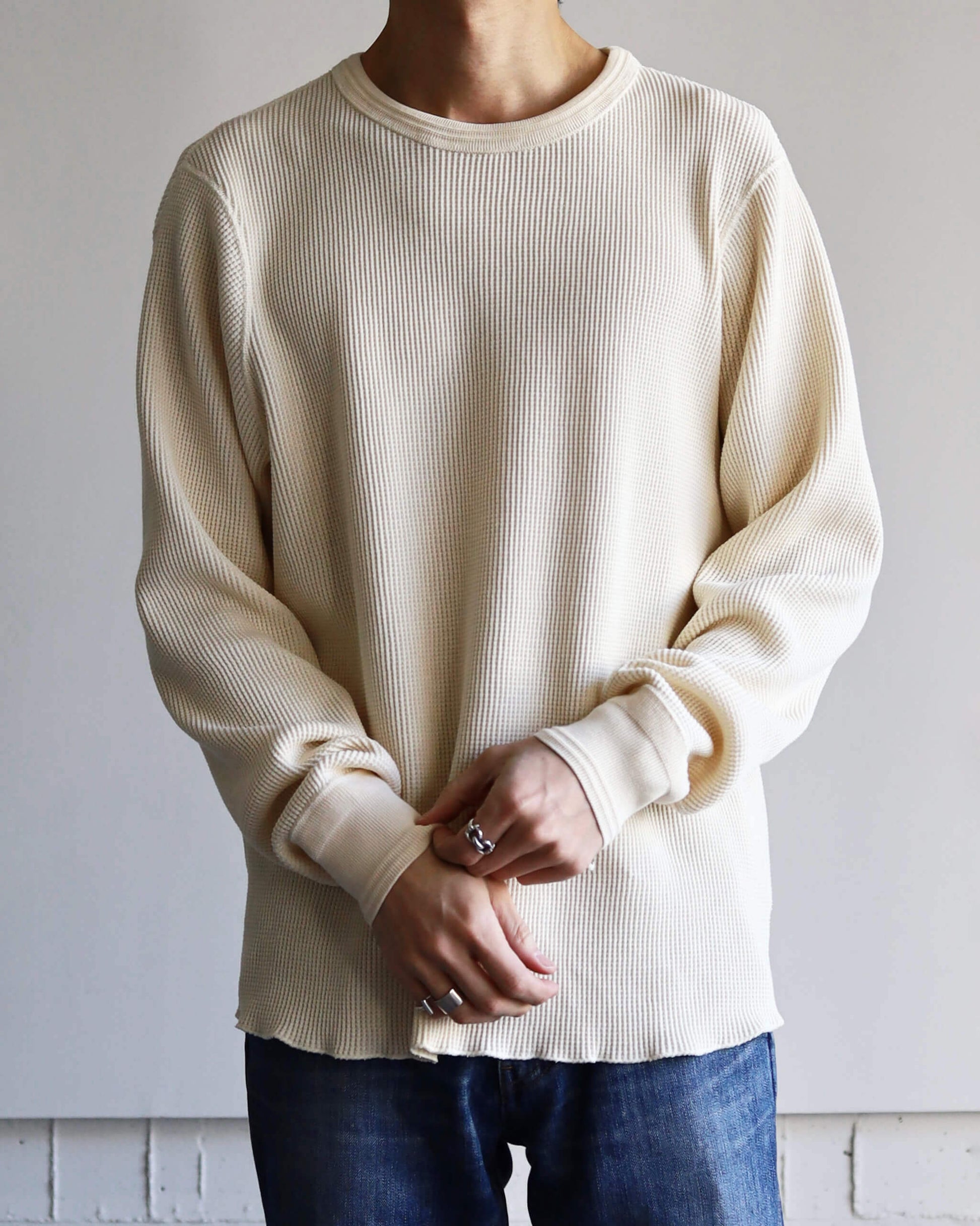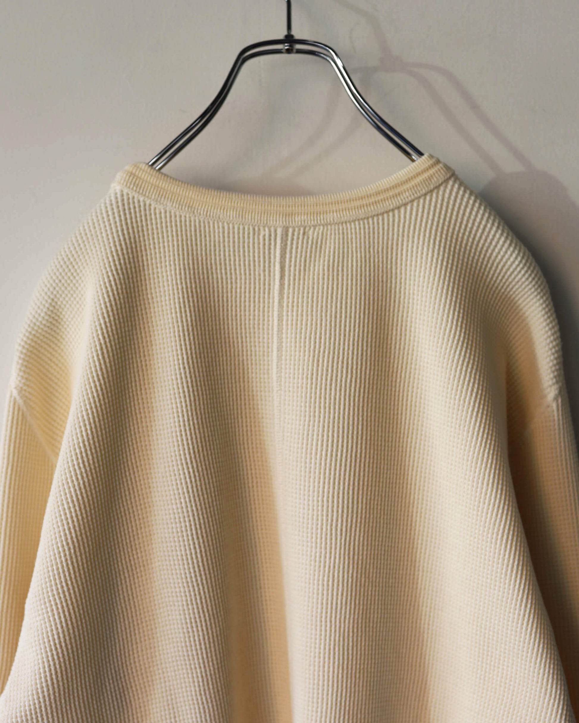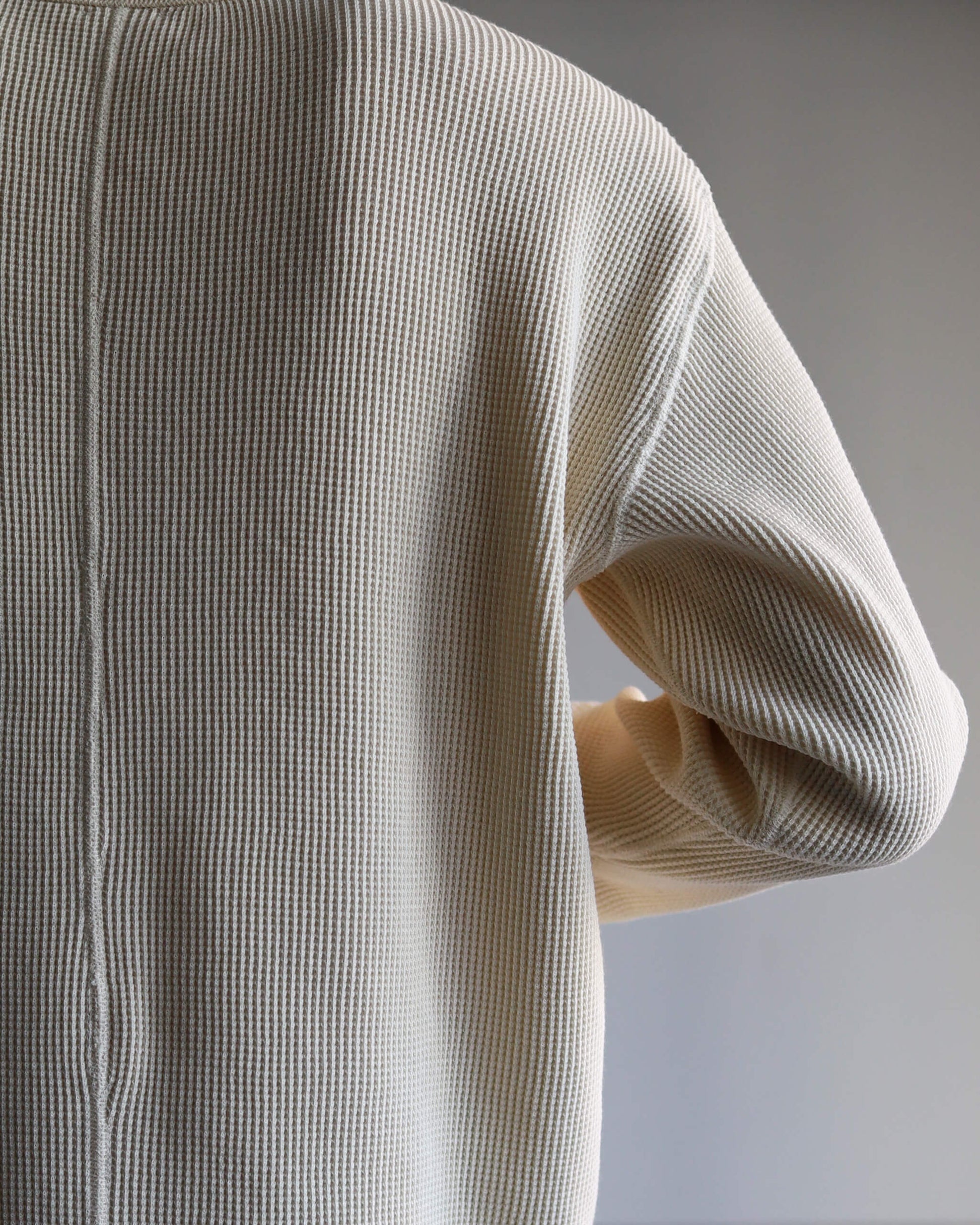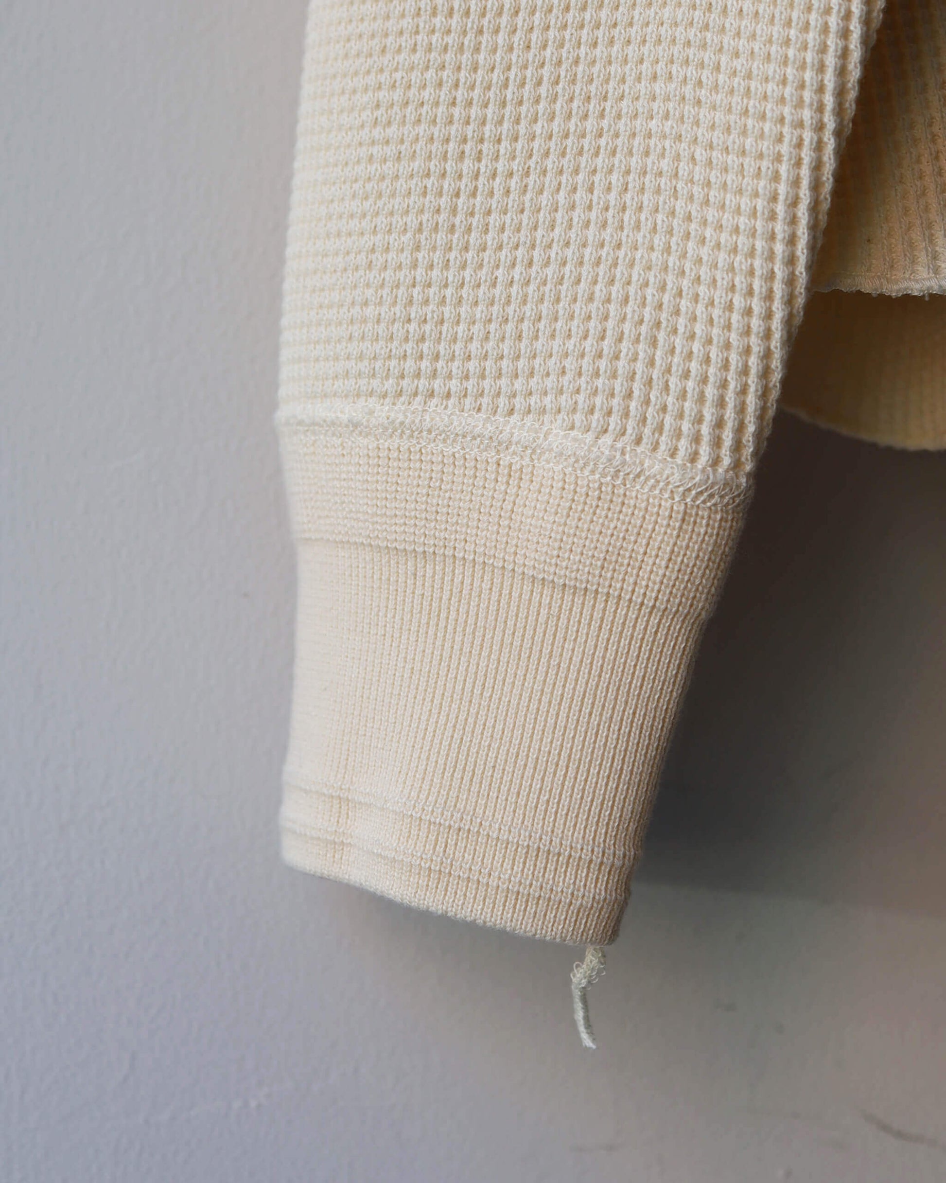 コットンワッフルにおける理想を追求し、番手から設計された引き揃え糸によって、目の立ち方・保温性・耐久性・肌あたりのすべてにおいて最適解を導き出した1枚です。