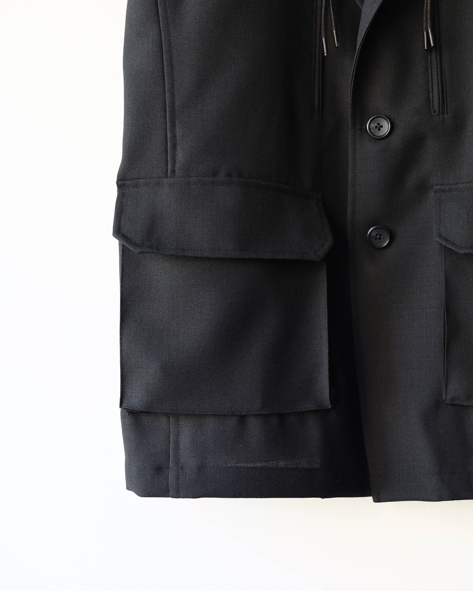 風除けの意匠を応用し、上前のラペルを二重に重ねることで着こなしのアレンジを可能にしています。