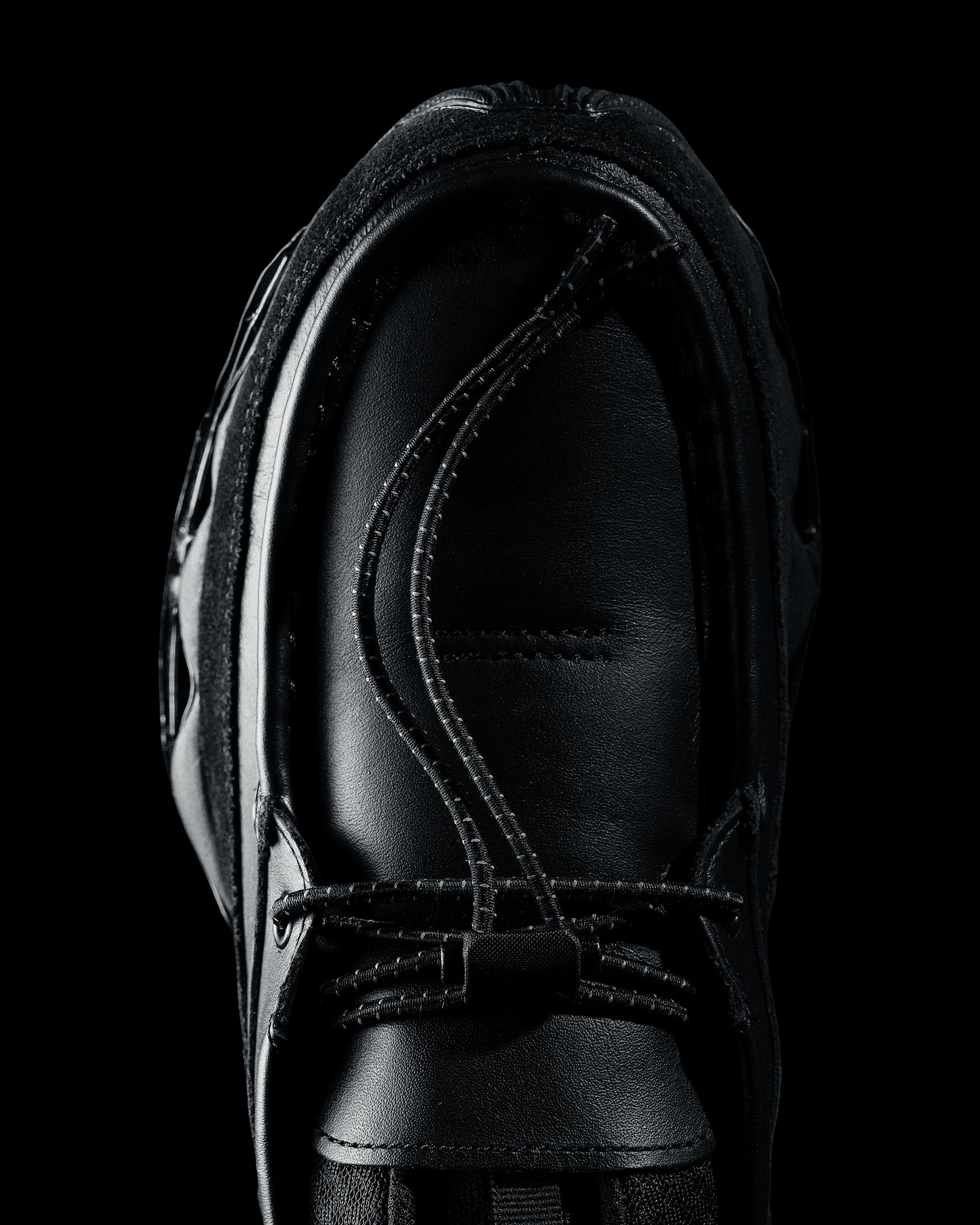 一方で、シューレースをアップデート。ブラックのスクエア型シューレースをメインに、レースストッパー型リフレクティブレースを付属。無骨さと都会的なムードがさらに際立つ仕様に。