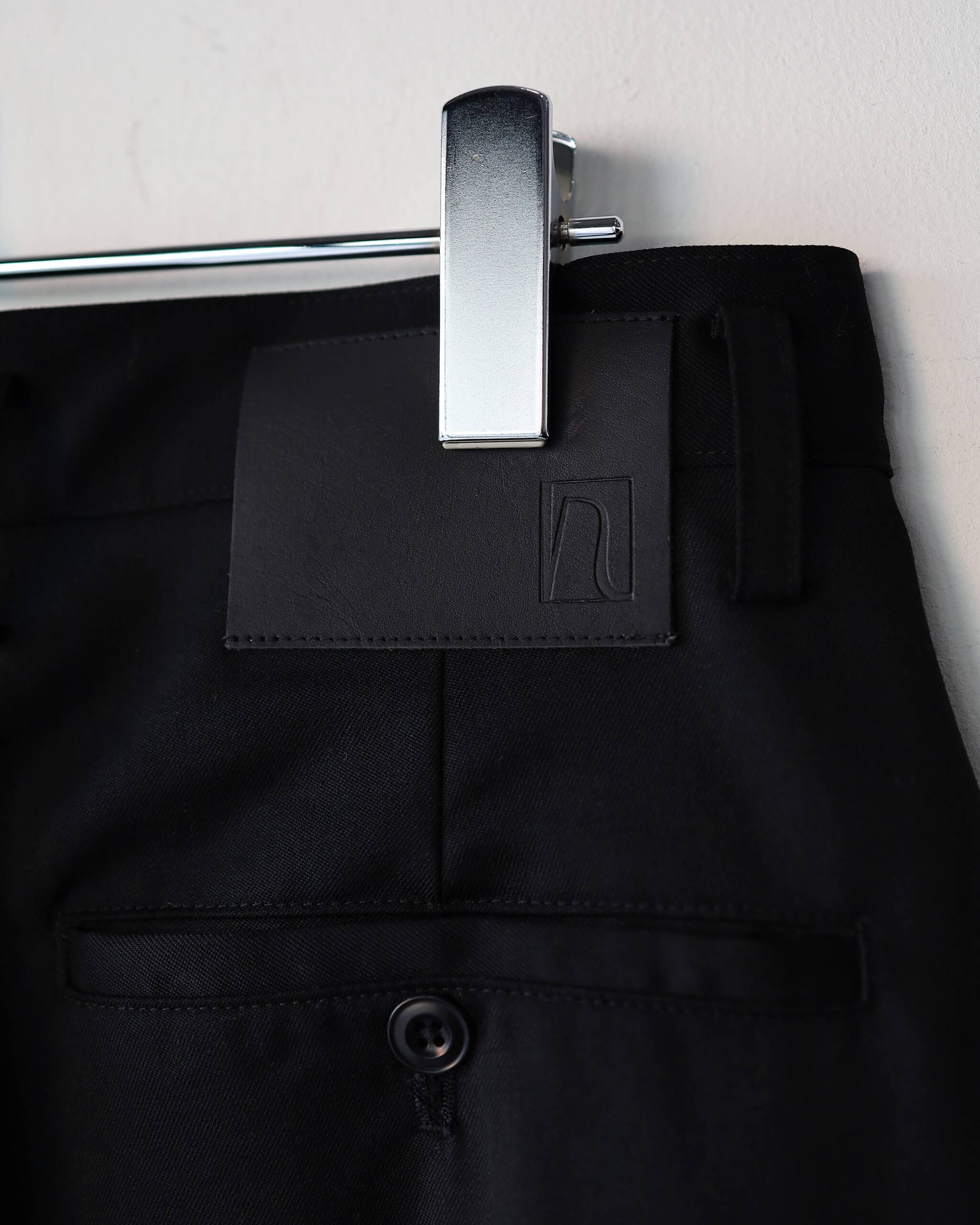 お馴染み "ASHLEY JEANS" のシルエットをスラックスへ落とし込み、ジーンズの要素を引き継ぎ、レザーパッチを付けています。